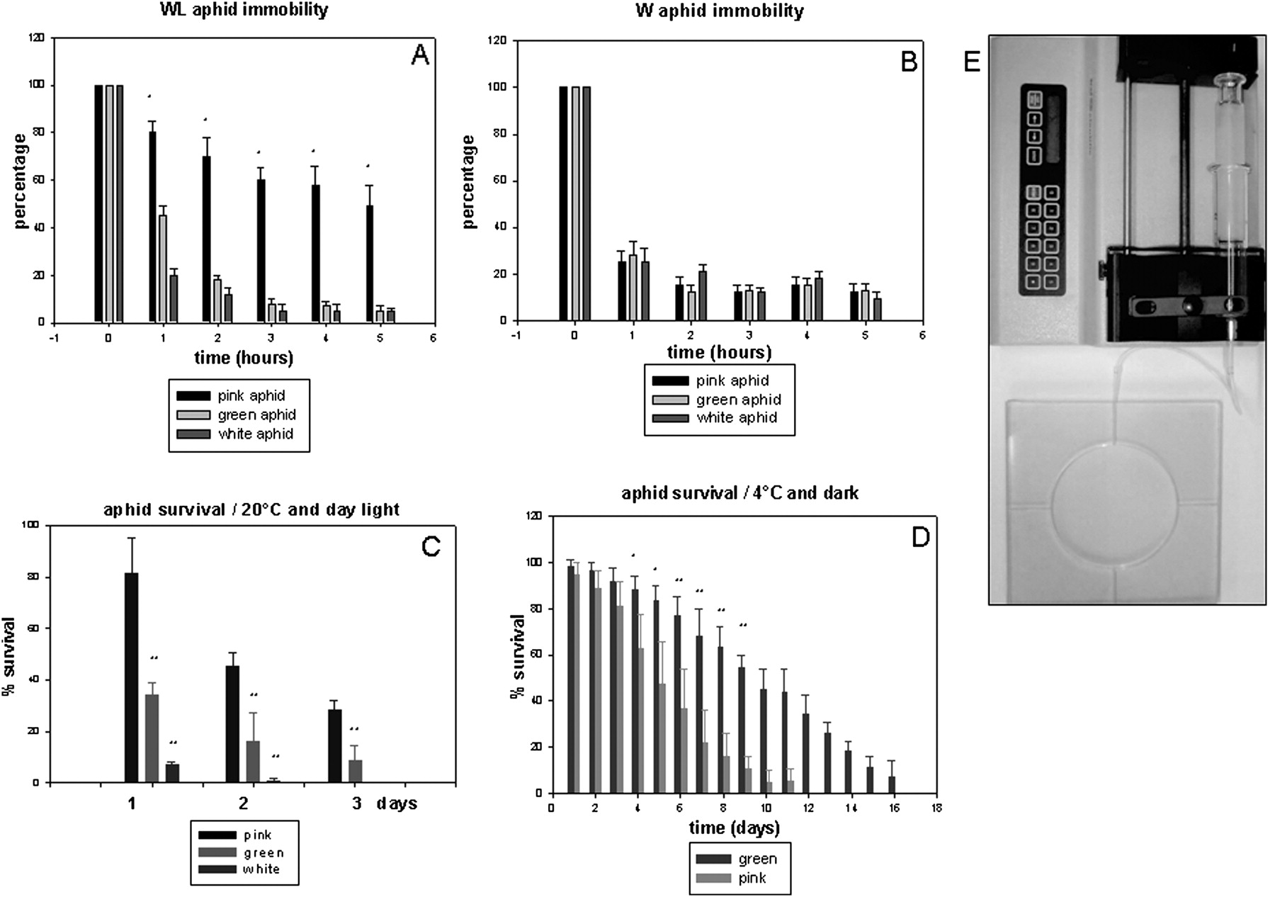 Behavioral studies of A. pisum aphid subclones. (A) Ninety-nine adult wingless aphids (33 white, 33 green, and 33 pink) were placed in an arena and exposed to saturating odors generated by Vicia faba plant extracts as described in Supplemental material. When animals were immobilized, the arena was opened and the time course of the percentage of insects that remained immobile was calculated. Experiments were repeated eight times and the bars indicate the SD. *P < 0.001. (B) The same experiment was performed as described in A except that the three phenotypes analyzed (pink, green, and white) are winged. (C) Aphid survival under conditions of starvation at room temperature. The adult green aphid (induced and propagated at 10°C), the adult pink aphid (propagated at 20°C), and the white aphid (propagated on declining plants at 20°C) were placed at room temperature without a host plant. The mortality rates were then measured every 24 h. This experiment was carried out with 60 aphids and repeated 10 times. The results are presented as a percentage of surviving animals. SD, standard deviation. **P < 0.001. (D) Aphid survival in starving and cold conditions. Adult aphids (pink, green, and white) were placed in an incubator at 5°C in the dark without a host plant and mortality was again measured every 24 h. This experiment was carried out using a group of 60 aphids and repeated 10 times. The results are presented as the percentage of surviving animals. SD, standard deviation. *P < 0.01; **P < 0.001. (E) Photograph of the apparatus and system used for behavioral studies (pusher, syringe, and arena).
