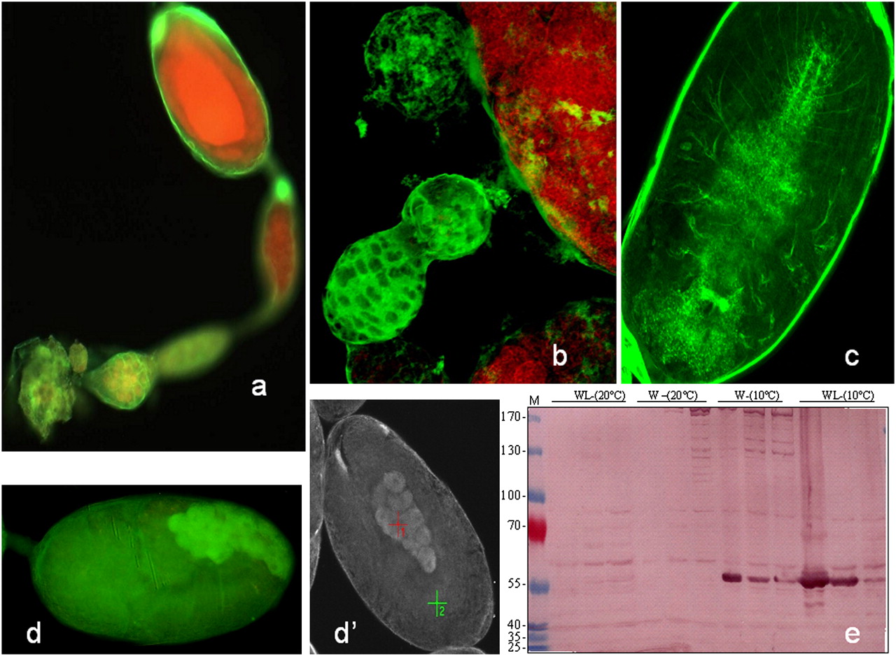 Immunohistological analysis of neuropeptides in aphid ovarioles. Dissected wingless adult ovarioles and embryos were fixed in 70% ethanol and overlaid with one of the following antibodies: anti-HRP or allatostatin followed by FITC second antibody labeling (see Supplemental material). (a) An intense fluorescent signal is evident in the ovariole envelope when stained with anti-HRP, and this pattern highlights the structural cells of the germarium (yellow). (b) Confocal microscopy shows strong fluorescent labeling of the germarium and the individualization of the first embryo. (c) Neuronal network inside an embryo labeled with an antibody anti-HRP recognizing insect neurons. (d,d′) Labeling with anti-allatostatin. The FITC fluorescent probe was confirmed by absorption spectrum in spectrometry. (e) The extracted A. pisum proteins were analyzed by a Western blot with antibodies against allatostatin (1:1000). (W) Winged aphid; (WL) wingless aphid; (M) molecular mass markers.