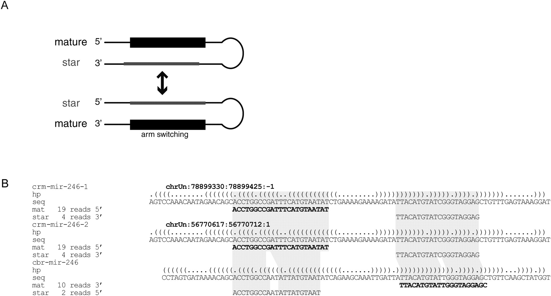 Arm-switching model of miRNA evolution. (A) Schematic representation of arm switching. In one miRNA hairpin, the 3′ arm provides the mature miRNA. In a slightly modified hairpin, the mature miRNA is the one that comes from the 5′ arm. (B) An example of arm switching. According to our cloning data, the duplicated loci of mir-246 in C. remanei express the 5′ arm as mature miRNAs, whereas this locus in C. briggsae expresses the 3′ arm as mature miRNA.