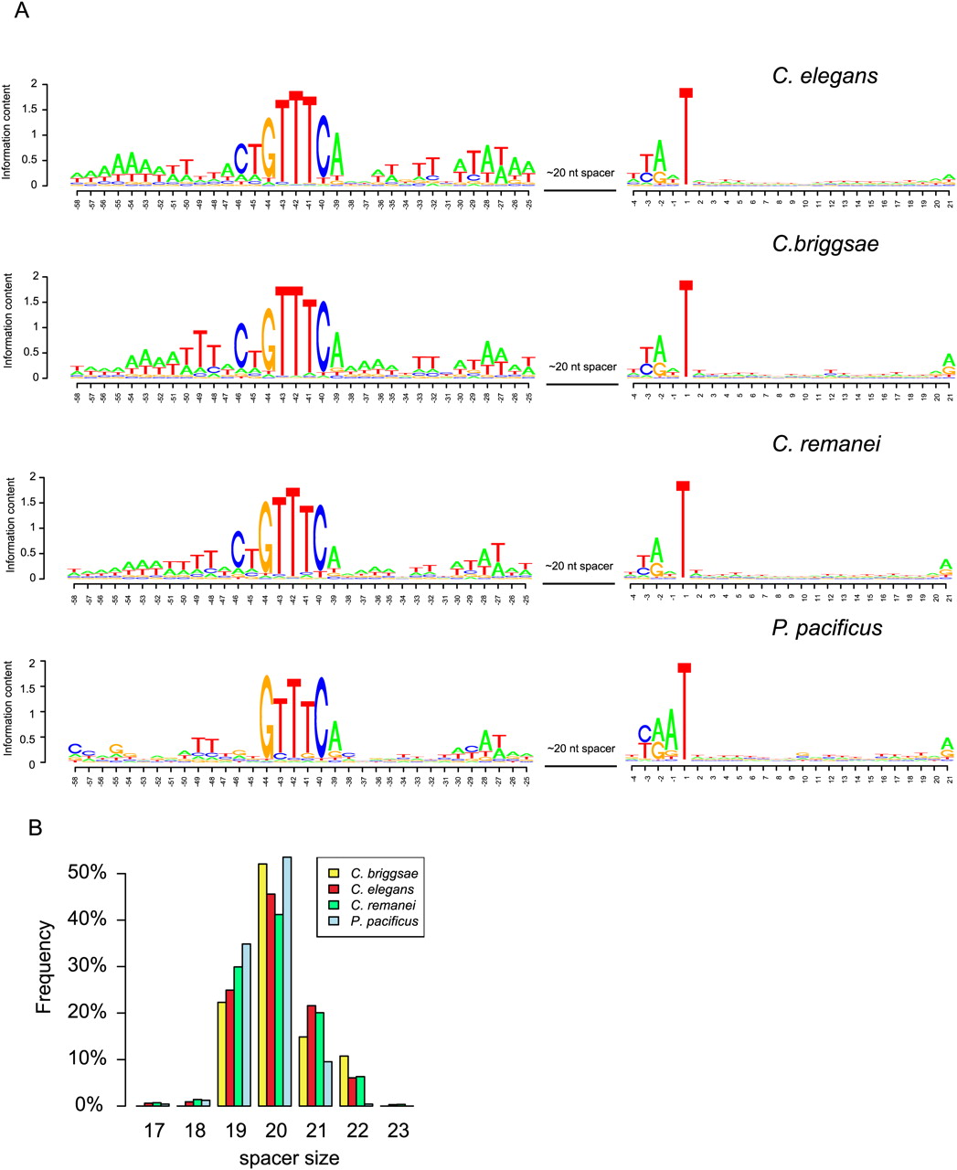 Upstream motifs of 21-U RNAs in different nematode species. (A) Consensus sequences for the upstream regions of the 21U-RNAs are displayed as sequence logos (Schneider and Stephens 1990) for all four nematode species. The consensus sequence is divided up into two regions: a small 4-nt motif directly upstream of the 21U-RNA and a larger motif ∼25 nt upstream of the 21U-RNA. Spacers of variable size separate these motifs. (B) The distribution of the spacer size is depicted for all species.