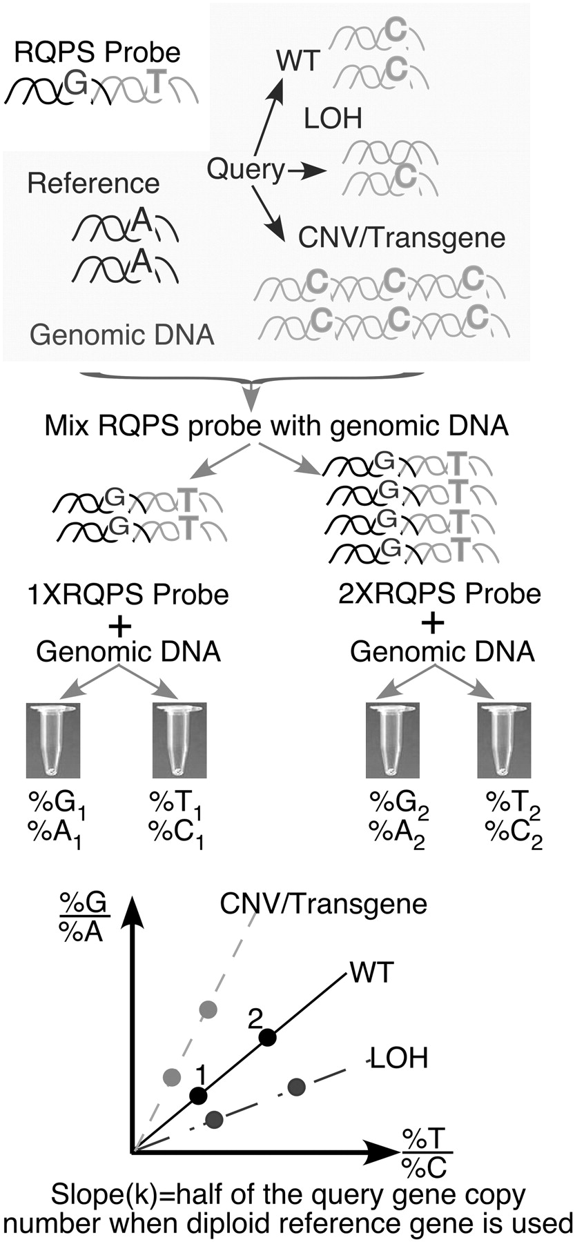 Schematic illustration of RQPS. A RQPS probe, which consists of a DNA fragment from the query gene physically linked to a DNA fragment from a reference gene, both containing artificially designed SNVs, is mixed with genomic DNA samples to attain a molar ratio between 1:9 and 9:1. The molar ratio of R-SNV, Q-SNV between probe and sample genomic DNA in each mixture is accurately determined by quantitative pyrosequencing. If the query gene is diploid, %G/%A = T%/C% (wild type, WT in the diagram). If one copy of the query gene is lost, %G/%A < T%/C% (loss of homozygosity, LOH in the diagram). If multiple copies of the query gene are present, then %G/%A > T%/C%. See text for details.
