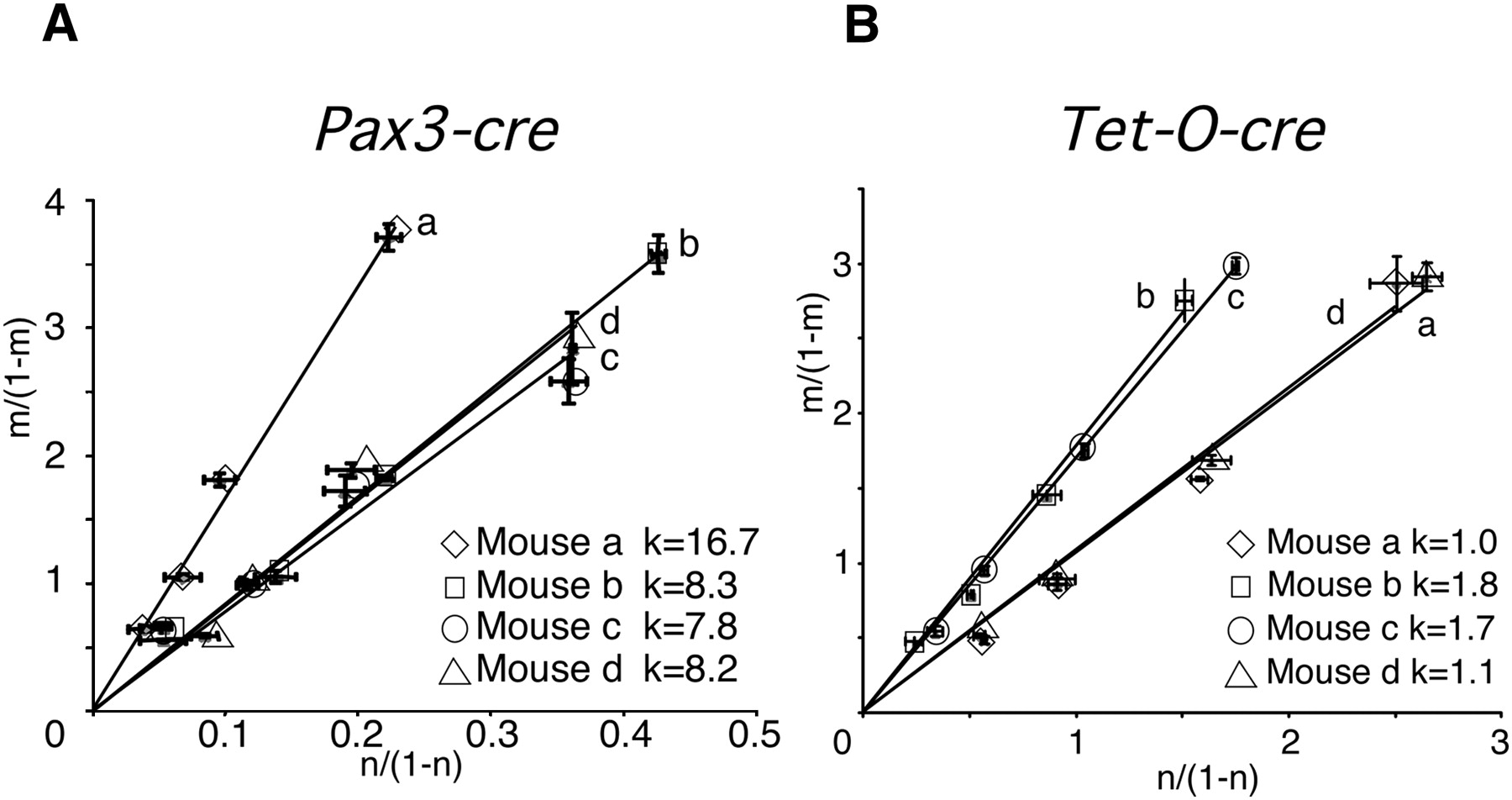 RQPS differentiates homozygous from heterozygous transgenic animals. (A) RQPS on four Pax3-Cre animals. In this experiment, four different dilutions of RQPS probe were made with genomic DNA samples from each mouse; this was done to demonstrate that any two concentrations would have worked as well. Note the very small standard deviations for each data point, indicating that triplicates or duplicates are not necessary. Pyrosequencing of each mixture was performed in triplicate, and the average values were plotted; the standard deviation of each data point is shown. (B) RQPS of Tet-O-Cre mice. The copy number of the Tet-O-Cre transgene was measured in four animals. Four different mixtures were pyrosequenced in duplicate for each sample. RQPS detected two homozygotes and two heterozygotes, with about two and four copies of the transgene, respectively.