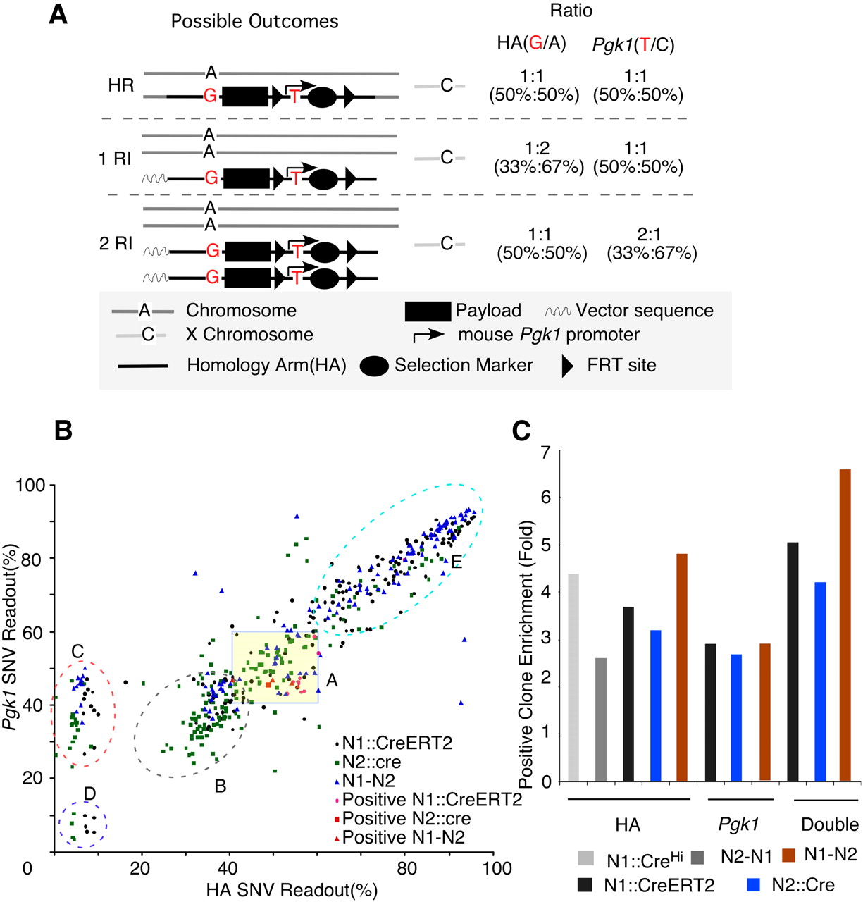 Pyroscreening of artificially introduced SNVs in targeting constructs dramatically enriched for positive HR clones. (A) Schematic illustration of pyroscreening. Artificially designed SNVs are introduced into targeting constructs: one in the HA (∼50 bp away from payload) and another one in the mouse Pgk1 promoter driving the expression of the selection marker. Different fates of the targeting construct in ES cells (HR, homologous recombination; RI, random integration) yield different ratios of the two linked SNVs to their endogenous counterparts. See text for details. (B) Pyroscreening of ES cells electroporated with (black dots) N1∷CreERT2, (green squares) N2∷cre, and (blue triangles) N1–N2. ES cells cluster into different groups. (Group A) Both HA and PGK SNV ratios fall between 40% and 60%, which suggests these are possible HR candidates. (Group B) HA SNV ratio ∼33% and PGK ∼40% suggest one copy of random integration. (Group C) The ratio suggests that these clones retained only one copy of the neomycin selection gene. (Group D) Poorly growing ES cells with heavy, G418-resistant MEF contamination. (Group E) ES cells that may have experienced multiple integrations. Note that nine out of 10 positive clones from (red dots) N1∷CreERT2, one out of one from (red square) N2∷Cre, and four of four from (red triangles) N1-N2 fall within group A. (C) When only one SNV is used for pyroscreening, the enrichment for positive clones is roughly threefold. This is increased to more than fourfold when two SNVs are combined.