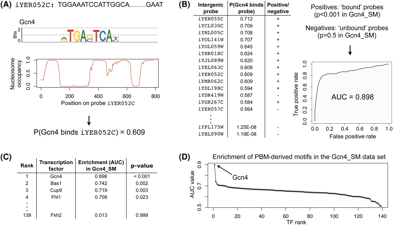 Identification of highly enriched motifs in a ChIP-chip data set. We proceed in four steps: (A) For each TF with a PBM-derived motif (here, Gcn4) and each intergenic probe (here, iYER052c), we compute the probability that the TF binds that probe, as described in the Methods section. (B) For each TF (here, Gcn4) we rank all intergenic probes in decreasing order of the binding probability and then compute the enrichment of the motif in a ChIP-chip data set (here, Gcn4_SM) according to AUC. To calculate the AUC statistic, we defined the positive and negative sets to be the sets of intergenic regions with ChIP-chip P-values < 0.001 and >0.5, respectively, as calculated by Harbison et al. (2004). (C) For each ChIP-chip data set (here, Gcn4_SM), we ranked all TFs in decreasing order of their motif's AUC value. (D) We determine the significantly enriched motif(s) (here, Gcn4).