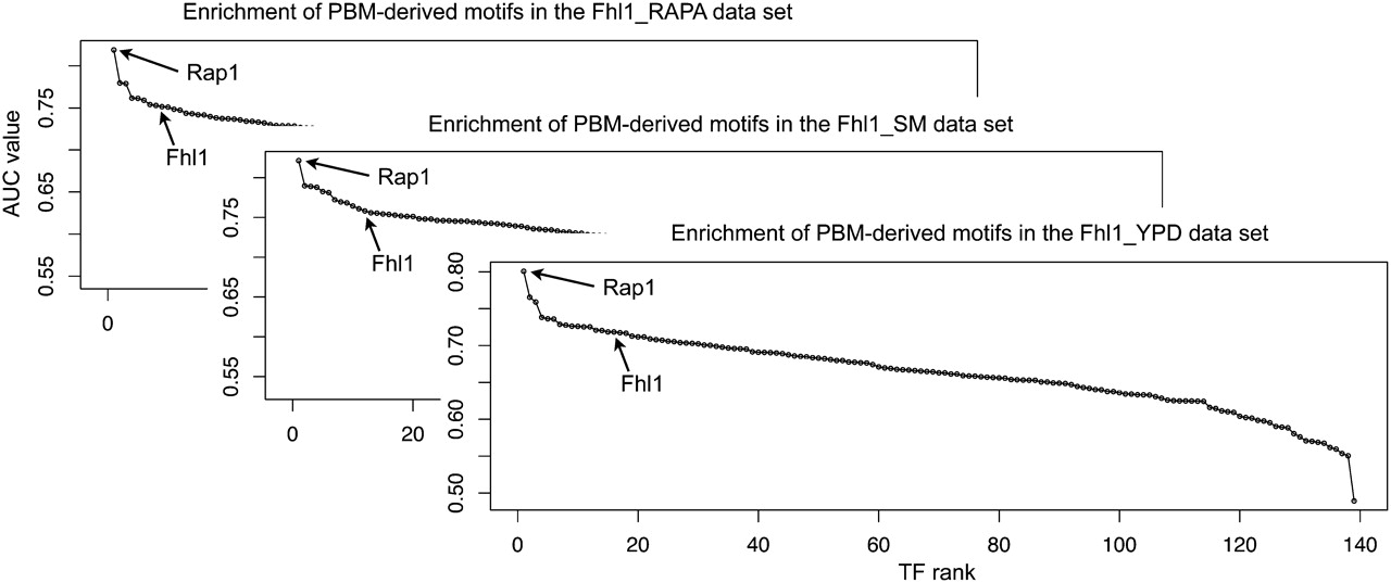 An example of indirect DNA association by a TF. The Rap1 motif is the only significantly enriched motif in all three Fhl1 ChIP-chip data sets: Fhl1_RAPA, Fhl1_SM, and Fhl1_YPD. The Fhl1 motif has only moderate AUC values and associated P-values that do not pass our significance criteria. We infer that in such cases many sequences identified as “bound” in the ChIP-chip experiments are actually indirectly bound by the profiled factor (here, Fhl1) through an interacting factor (here, Rap1).