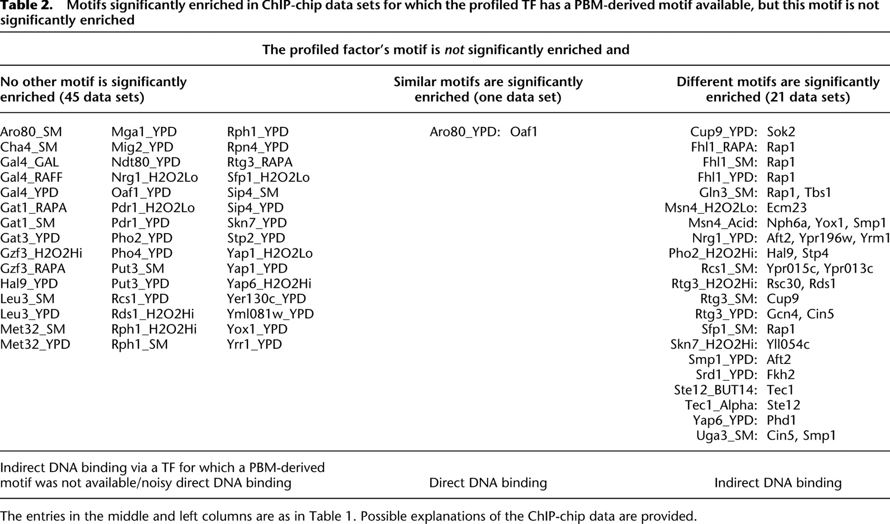 The entries in the middle and left columns are as in Table 1. Possible explanations of the ChIP-chip data are provided.