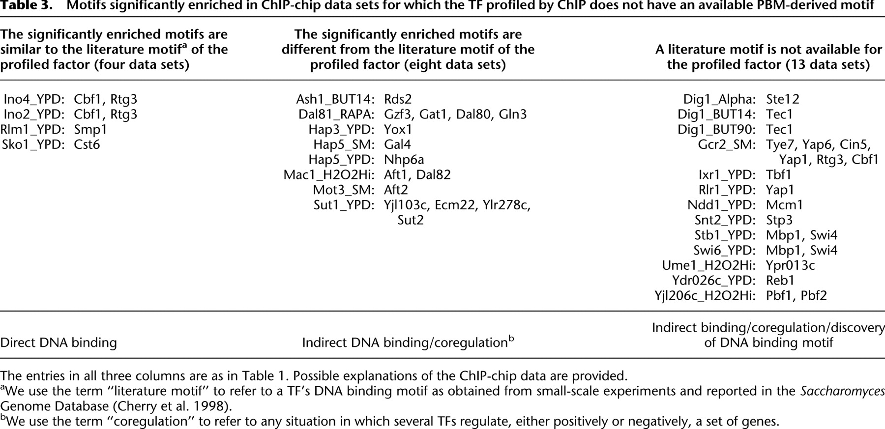 The entries in all three columns are as in Table 1. Possible explanations of the ChIP-chip data are provided.