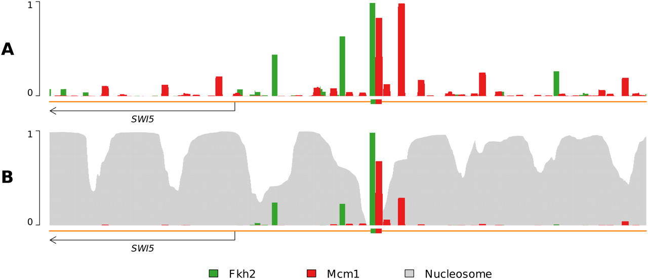 Nucleosome binding attenuates nonfunctional transcription factor binding. (A) A profile using a model of only TFs and DNA yields many (presumably nonfunctional) binding predictions throughout the genome. The binding of Fkh2 and Mcm1 is significant even away from their annotated binding sites; Mcm1 even displays an upstream (to the right) binding occurrence stronger than at its annotated site. However, Fkh2 and Mcm1 form a ternary complex with DNA and are known to bind adjacently to one another, making the observation of this additional, stronger, binding occurrence somewhat curious. (B) Addition of nucleosomes yields a dramatically altered TF occupancy profile. Fkh2 and Mcm1 binding is notably diminished at sites other than annotated binding sites, though not entirely eliminated. Additionally, the strong upstream Mcm1 binding event occurs at a much-reduced level, now approximately half as frequently as that of the annotated Mcm1 binding site.