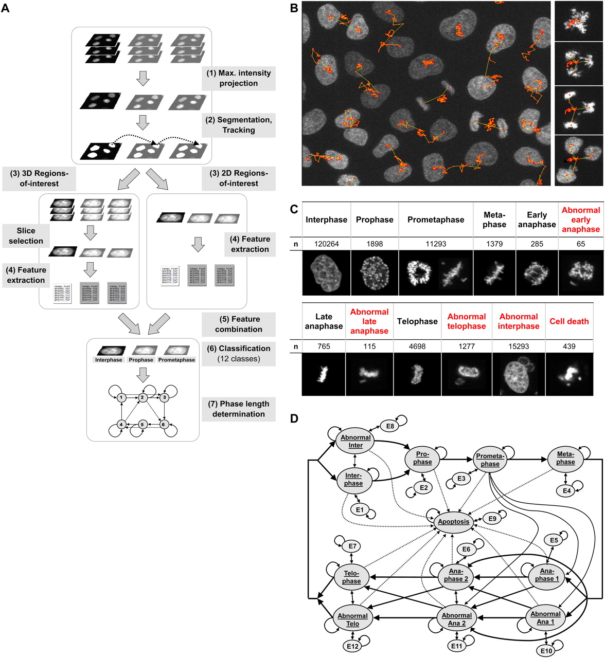 Phase length determination. (A) Image analysis workflow. Steps from top to bottom: (1) maximum intensity projection resulting in 2D image sequences, (2) segmentation and tracking, (3) determination of 2D regions-of-interest in the projected images and 3D regions-of-interest in the original 3D images, (4) computation of image features on the projected images for 2D regions-of-interest, computation of image features on the most informative slices for 3D regions-of-interest, (5) combination of both feature sets, (6) classification to determine the mitotic phases, (7) consistency check and phase length determination for resulting phase sequences. (B) Tracking result for several dividing cell nuclei (left) and for a nucleus that divides into three daughter nuclei (right). (C) Sample images to illustrate the considered 12 classes, including seven normal cell cycle phases (black), four morphological phenotype classes, and a cell death class (red). n is the total number of processed samples per class. (D) Finite state machine (FSM) to check and correct phase sequences. The phases are modeled by the states of the FSM, the possible phase transitions are represented by the state relations. If an illegal phase transition occurs, the FSM passes into the respective error state. For clarity not all relations of the error states E1–E12 are displayed.