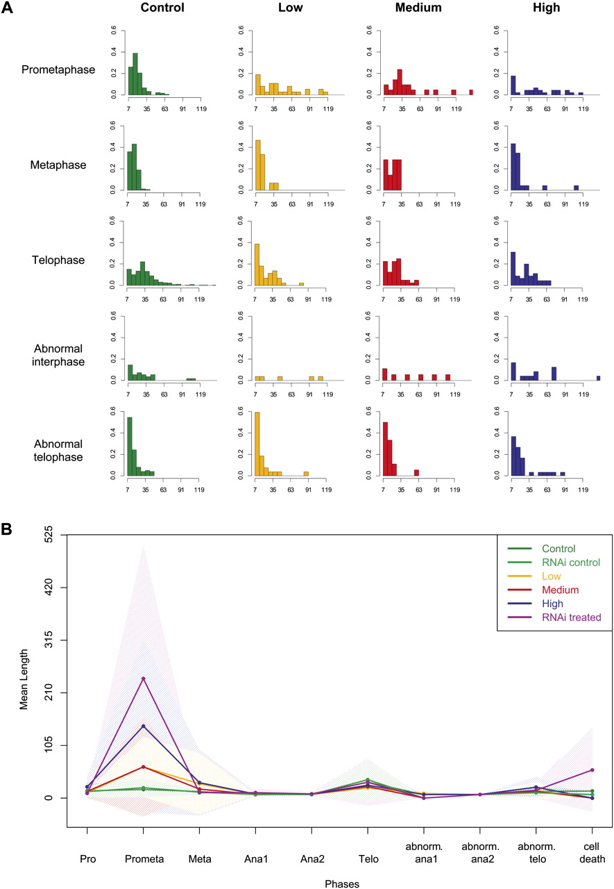 Automatically computed phase lengths. (A) Phase length histograms for automatically annotated data. X-axis, phase length (min); y-axis, relative frequency. Histograms are displayed for a maximum length of 140 min (20 time steps). (B) Mean phase lengths (min.) for the automatically annotated data for all treatments and controls. The shaded regions indicate the standard deviations.