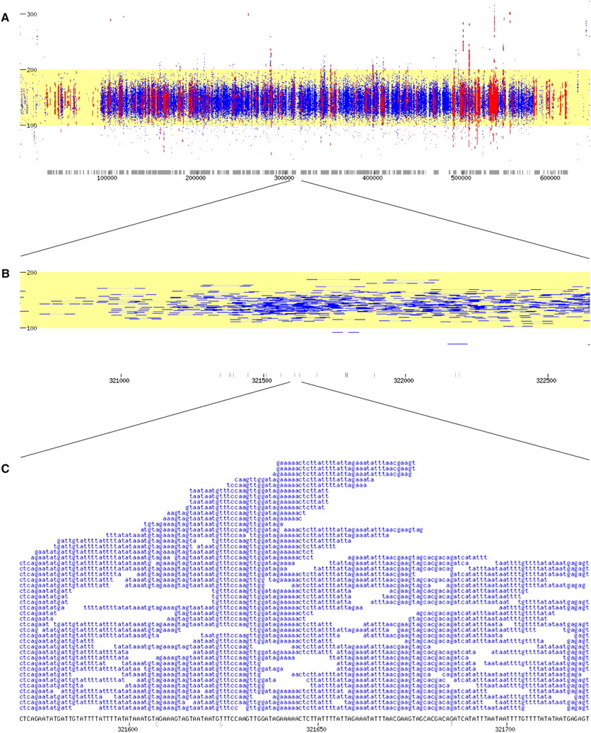 Different zooms/views. (A) InDel view, whole chromosome. (B) InDel view, 2-kbp region. (C) Pile-up view, single-base resolution. Perfect matching bases are in blue; mismatches (potential SNPs) are in red, and range of expected fragment size is in yellow.