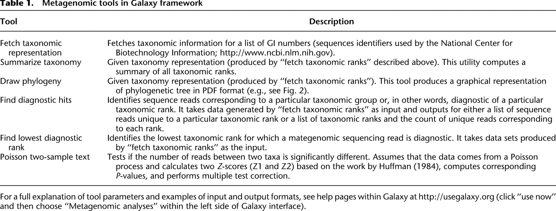 For a full explanation of tool parameters and examples of input and output formats, see help pages within Galaxy at http://usegalaxy.org (click “use now” and then choose “Metagenomic analyses” within the left side of Galaxy interface).