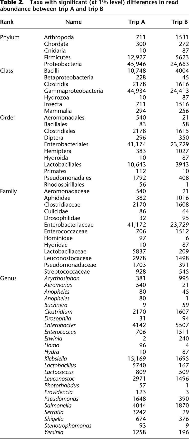 Taxa with significant (at 1% level) differences in read abundance between trip A and trip B