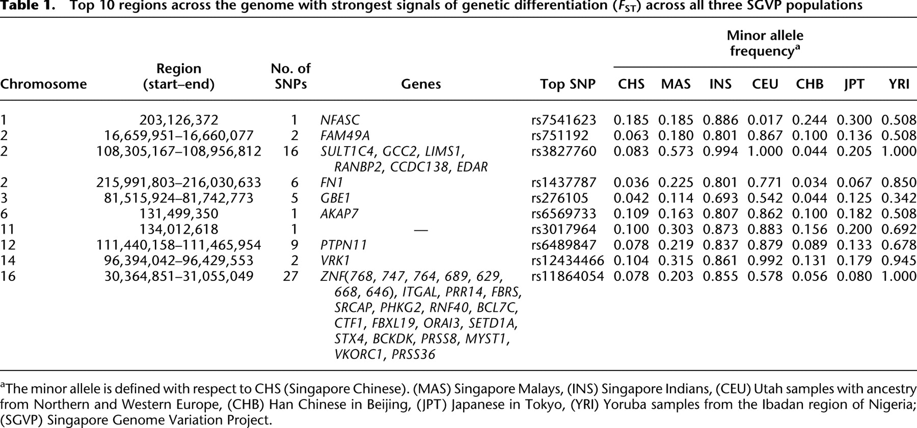aThe minor allele is defined with respect to CHS (Singapore Chinese). (MAS) Singapore Malays, (INS) Singapore Indians, (CEU) Utah samples with ancestry from Northern and Western Europe, (CHB) Han Chinese in Beijing, (JPT) Japanese in Tokyo, (YRI) Yoruba samples from the Ibadan region of Nigeria; (SGVP) Singapore Genome Variation Project.