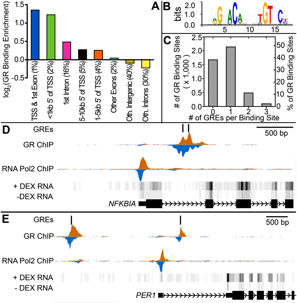 Genomic distribution of glucocorticoid receptor binding sites and response elements. (A) Enrichment of GR binding sites in genomic features. The percentage of all identified GR binding sites in each type of region, indicated in parentheses, was divided by the relative amount of the human genome each type of region occupies and plotted on a log2 scale. (B) The revised glucocorticoid response element (GRE) identified in the most significant GR binding sites identified by ChIP-seq. (C) Distribution of the number of GREs in identified high-confidence GR binding sites across the human genome. (D,E) Example ChIP-seq data showing GR and Pol II (RNA Pol2) binding at GREs near the NFKBIA and PER1 genes. ChIP-seq data are plotted as the density of 25-bp tags mapping to the region. The density is separated to show reads mapping to the positive (orange) and negative (blue) strand of the reference genome. For RNA-seq data, darker indicates more expressed.