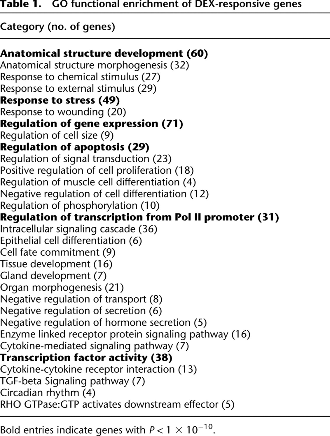 Bold entries indicate genes with P < 1 × 10−10.