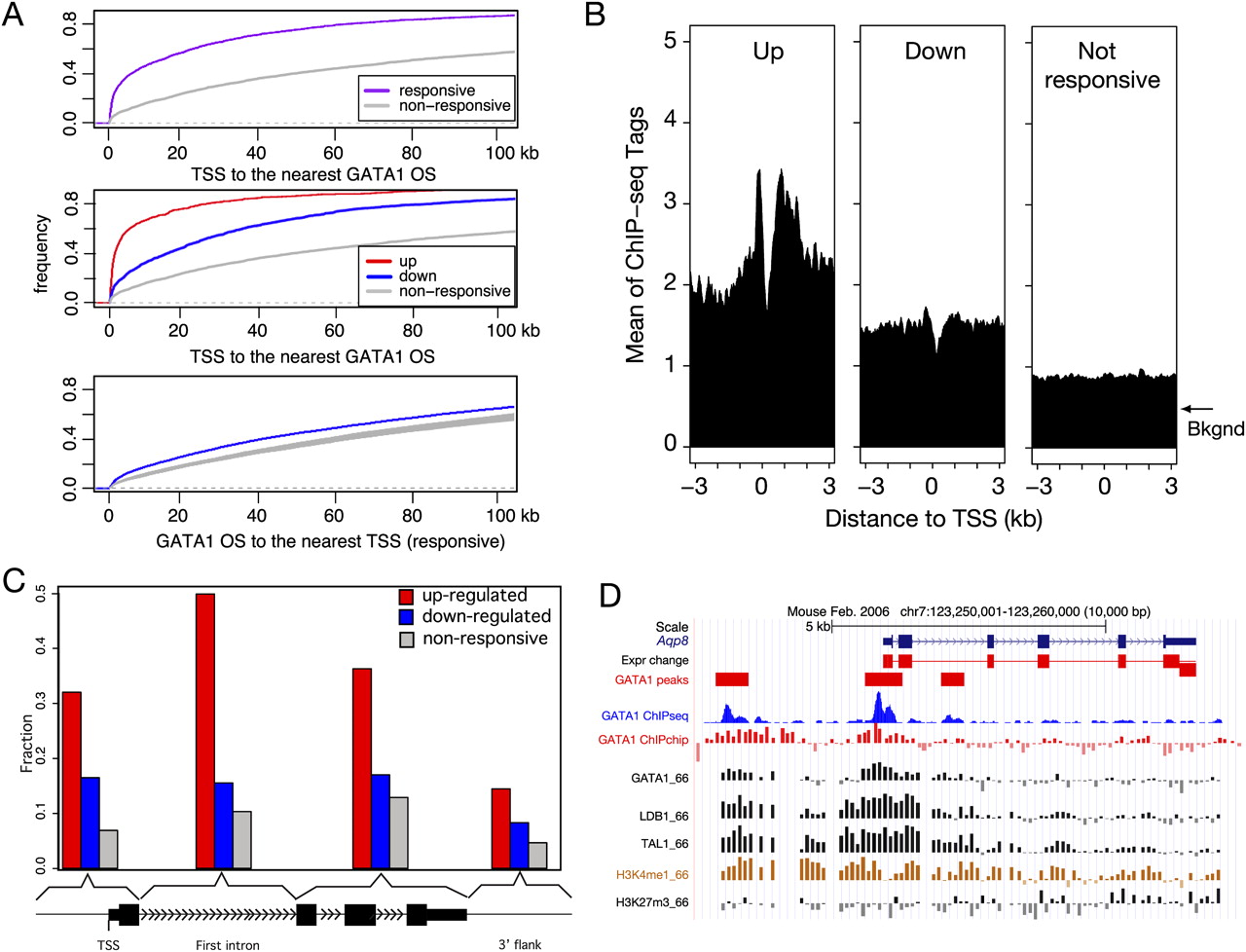 Proximity of induced genes to GATA1-occupied DNA segments. (A) The cumulative distribution of the distance from the TSS of each gene in a response category to the nearest GATA1-occupied DNA segment (GATA1 OS) is shown in each panel, with the y-axis showing the fraction of genes whose nearest GATA1 OS is within the designated distance. The color of each distribution line is distinctive for each response category (purple for all responsive genes, red for up-regulated, blue for down-regulated, and gray for nonresponsive genes). The distributions of distances from the GATA1 OSs to the TSS of responsive genes are shown in the bottom panel, with the gray lines for 1000 iterations of random selection of TSSs from 2616 nonresponsive genes. (B) GATA1 occupancy signals near the TSSs. The distribution of raw GATA1 ChIP-seq signals (mean number of ChIP-seq tags in 100-bp windows) is graphed as a function of distance on either side of the TSS of genes in three response categories. DNA upstream of the TSS is given a negative value for the distance from the TSS. All the genes in a designated category were first centered by the TSS and then windows were extended along each side of TSS up to 3 kb. (C) Preferred locations of GATA1-occupied segments with respect to genes. The bar graph presents the fraction of genes in each response category that has at least one GATA1 OS in the indicated subregion of a gene. These subregions are segments around the TSS (−5 kb from the TSS to the end of the first exon), the first intron, the remaining exons and introns, and 5 kb past the poly(A) addition site. (D) An example of newly discovered GATA1 OSs close to the TSS of the GATA1-incuded gene Aqp8. Tracks are as in Fig. 1B.