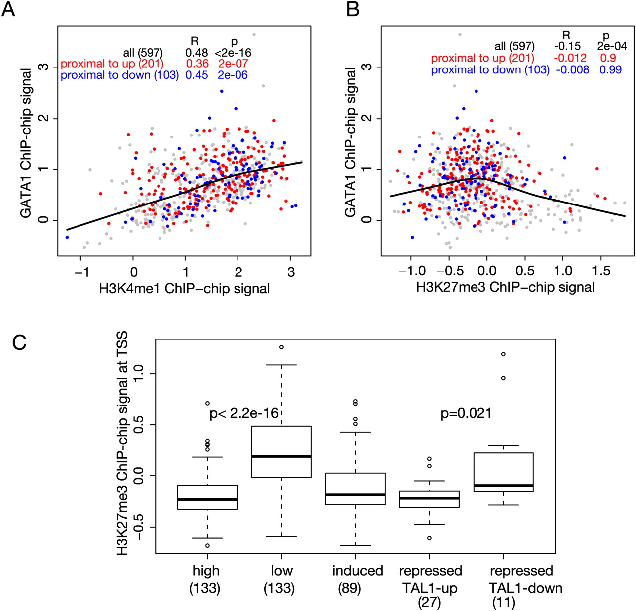 Correlations of histone modifications with occupancy and transcriptional status. (A,B) Scatterplots showing the correlation of GATA1 occupancy (proxied by mean ChIP-chip signal on the y-axis) with the levels of monomethylation of histone H3K4 (H3K4me1, x-axis in A) or with levels of trimethylation of histone H3K27 (H3K27me3, x-axis in B) in each GATA1 OS. The histone modifications were determined in G1E-ER4 cells treated with estradiol. Colors of the dots for GATA1 OSs are red for those associated with up-regulated genes, blue for those associated with down-regulated genes, and gray for all other GATA1 OSs in the 66-Mb region of chromosome 7. The lowess line is for all the data points, and correlations for the different expression categories are given in the inset table in each graph. (C) Boxplot comparing the distributions of H3K27me3 around the TSS of genes in the indicated expression categories. The mean levels of the histone modification around the TSS for each gene in a category were computed. The distributions are significantly different when comparing the high (top quartile of expression levels from the transcriptome analysis) versus low expressed genes (bottom quartile) (P < 2.2 ×10−16) and repressed genes distinguished by co-occupancy between GATA1 and TAL1 (TAL1-down vs. TAL1-up, P = 0.021), using a single-tailed t-test. The numbers of genes in each category are given in parentheses.