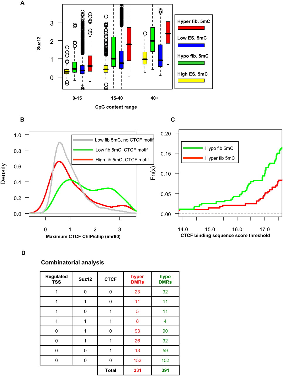 CTCF and Polycomb are correlated with differential methylation. (A) SUZ12 occupancy. Shown are box plots for average human SUZ12 occupancy on mapped monkey DMRs and background regions. We separately plot groups of regions with different levels of CpG content, dissected into (red) hyper-DMRs, (green) hypo-DMRs, (blue) regions with low ES methylation, and (yellow) regions with high ES methylation. In general, regions with high methylation have low SUZ12 levels (e.g., lower than regions with low methylation; see CpG content 15–40). Moreover, regions with higher CpG content (>40) that are hyper- and hypomethylated are enriched in SUZ12 targets. (B) CTCF occupancy at CTCF motifs. Shown are distributions of CTCF binding levels in three groups of genomic loci: (1, gray) background regions lacking CTCF motifs and having low DNA methylation; (2, red) regions of high methylation featuring CTCF binding motifs; (3, green) regions with low DNA methylation featuring CTCF binding motifs. (C) CTCF binding capacity at DMRs. Shown are cumulative probability distributions for the predicted binding energy of the CTCF motif in (red) hyper-DMRs and (green) hypo-DMRs. About 15% of the hypo-DMRs have a strong CTCF binding site, much higher than the percentage for hyper-DMRs. (D) Combinatorial analysis. Shown are counts of DMRs associated with combinations of regulated TSS, SUZ12 hotspot, or CTCF binding site. More than half of the DMRs have at least one factor associated with them.