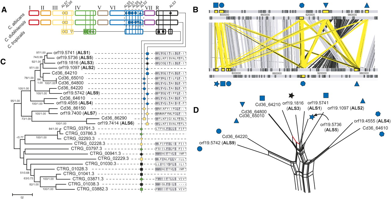 Comparative genomics and phylogeny of agglutinin-like sequences (ALS) in Candida spp. (A) A cartoon showing genomic distribution of ALS loci in C. albicans, C. dubliniensis, and C. tropicalis. The positions of loci are indicated by vertical lines and the presence of a gene(s) is represented by a unique symbol (which is also applied to positional orthologs in other species). A dashed line indicates the region of chromosome 6 expanded in panel C. Note that the chromosomes are drawn based on the C. albicans karyotype, with C. dubliniensis and C. tropicalis pseudochromosomes drawn for comparison, reflecting their conserved gene order, but not precise karyotypes. (B) Maximum likelihood phylogeny of ALS N-terminal nucleotide sequences in C. albicans (for which gene names ALS1-9 are given), C. dubliniensis (prefixed Cd36_) and C. tropicalis (prefixed CTRG_). Branch lengths are proportional to evolutionary change and measured in substitutions/site. This topology was concordant with an alternative Bayesian consensus tree; each node is attended by nonparametric bootstrap values and posterior probabilities from likelihood and Bayesian analyses respectively. Terminal nodes are labeled with gene IDs and locus symbols (as used in A), and then to the 14 amino acid sequence of the C terminus (where available). (C) ACT representation of ALS loci on chromosome 6 in C. dubliniensis (top) and C. albicans (bottom). ALS genes are shaded yellow and marked as in A. Significant TBLASTX hits between genes are represented by vertical bars (gray, sense; black, anti-sense; yellow, ALS). (D) Phylogenetic network showing a consensus of all possible relationships among chromosome 6 genes simultaneously. Splits supporting monophyly of Cd36_64210 and ALS1 are shown in red.