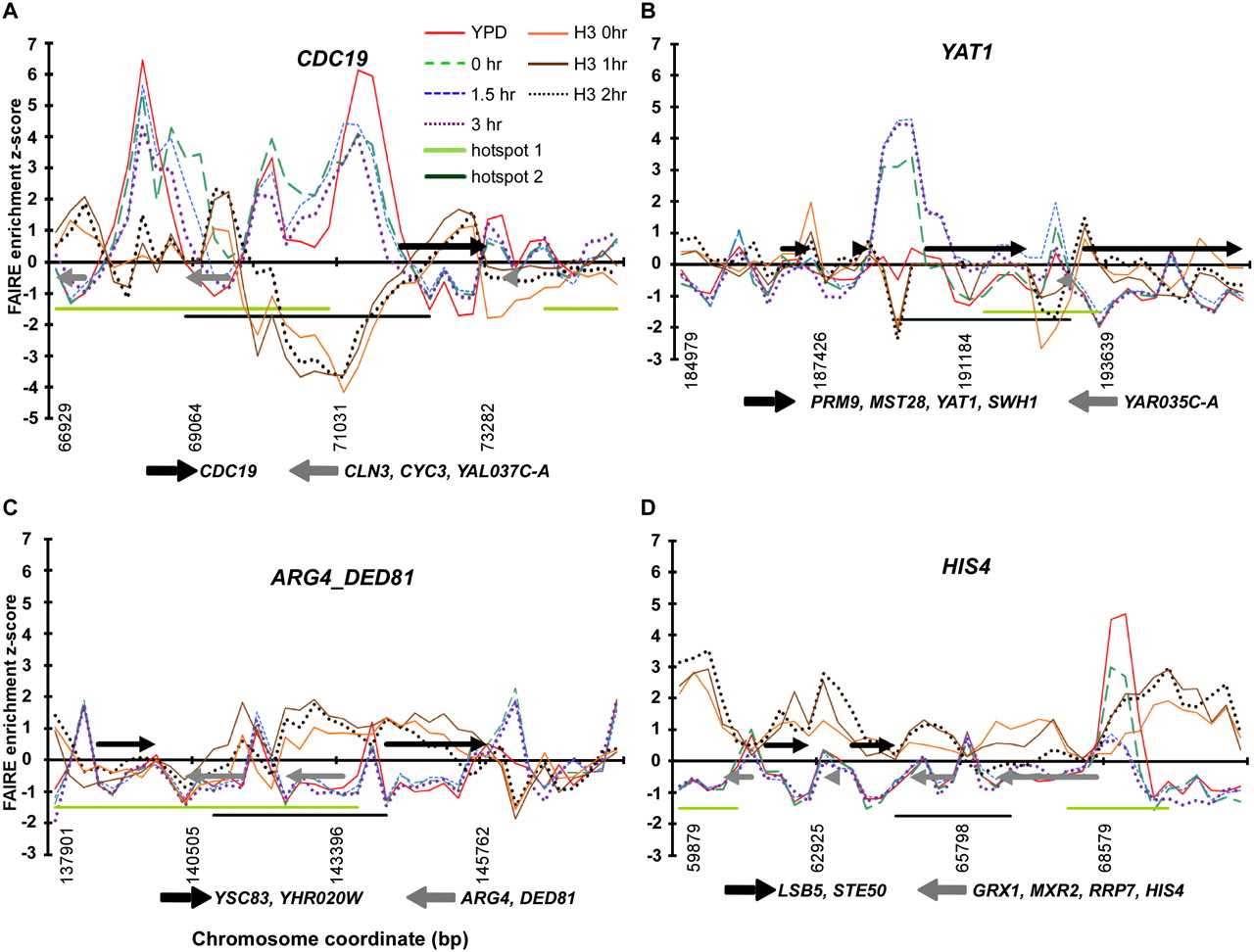 Chromatin at known hotspots is dynamic. Chromosome coordinates are plotted along the x-axis, with FAIRE enrichment (z score) plotted on the y. Positive z scores indicate relatively open chromatin, and negative numbers indicate relatively closed chromatin. FAIRE data from YPD (red), 0-h (dashed green), 1.5-h (blue fine dashes), and 3-h (purple and dotted) samples are plotted. Among the 1204 sites, 151 were open in all the meiosis samples (1.5 and 3 h), but not during mitotic growth (e.g., YAT1). Conversely, 156 sites were open during mitotic growth, but were not open in any of the meiotic samples. Meiotic histone H3 ChIP-chip data from 0 h (orange), 1 h (brown), and 2 h (dark brown and dotted) are plotted (Borde et al. 2009). Hotspot regions identified by Buhler et al. (2007) (light-green bars), and by Blitzblau et al. (2007) (dark-green bars) are shown. Arrows represent the coding regions of genes, with those above the x-axis coded from the Watson strand and those below coded from the Crick strand. (A) Chromatin dynamics at the CDC19 hotspot on chromosome I, an example of a hotspot with constitutively open chromatin. (B) Chromatin dynamics at the YAT1 hotspot on chromosome I, an example of a meiosis-specific site of open chromatin. (C) Chromatin dynamics at the ARG4_DED81 hotspot on chromosome VIII (Wu and Lichten 1994; Ohta et al. 1999), an example of a DSB hotspot with no observed open chromatin in any sample. (D) Chromatin dynamics at the HIS4 hotspot on chromosome III, an example of a hotspot at which the chromatin is open in YPD and closes as meiosis progresses.