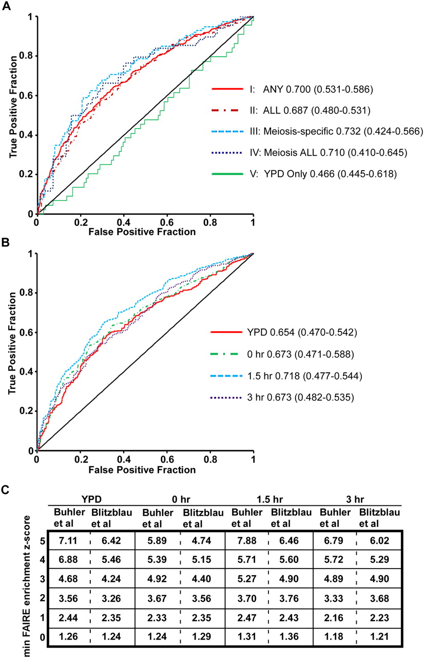 The degree of chromatin openness is predictive of DSB hotspots. (A) ROC curve analysis of the five categories of open chromatin. True-positives and false-positives are defined with respect to DSB hotspots (Buhler et al. 2007) (Methods). The FAIRE sites plotted are ordered such that those to the left are most open according to FAIRE (lowest P-value), and those to right, while still significantly open, have higher P-values. Data from category I (solid red), category II (maroon dashes), category III (light-blue dashes), category IV (dark-blue dots), and category V sites (solid green) are plotted. AUC values are listed next to the sample name, and the minimum and maximum AUC values of the random permutations follow in parentheses. (B) ROC curve analysis of sites of open chromatin in individual time points. Data from YPD (red), 0-h (green dashes), 1.5-h (light-blue dashes), and 3-h (purple dots) samples are plotted. (C) DSB predictive value of individual probes with FAIRE z scores above the indicated threshold, expressed as likelihood ratios. Values in the table are TPF/FPF at decreasing z score thresholds, listed vertically on the left. Time points are organized on the horizontal axis. Predictive value is expressed with respect to two DSB hotspot datasets (Blitzblau et al. 2007; Buhler et al. 2007). Because this analysis is probe based, multiple true-positives may be derived from a single DSB hotspot.