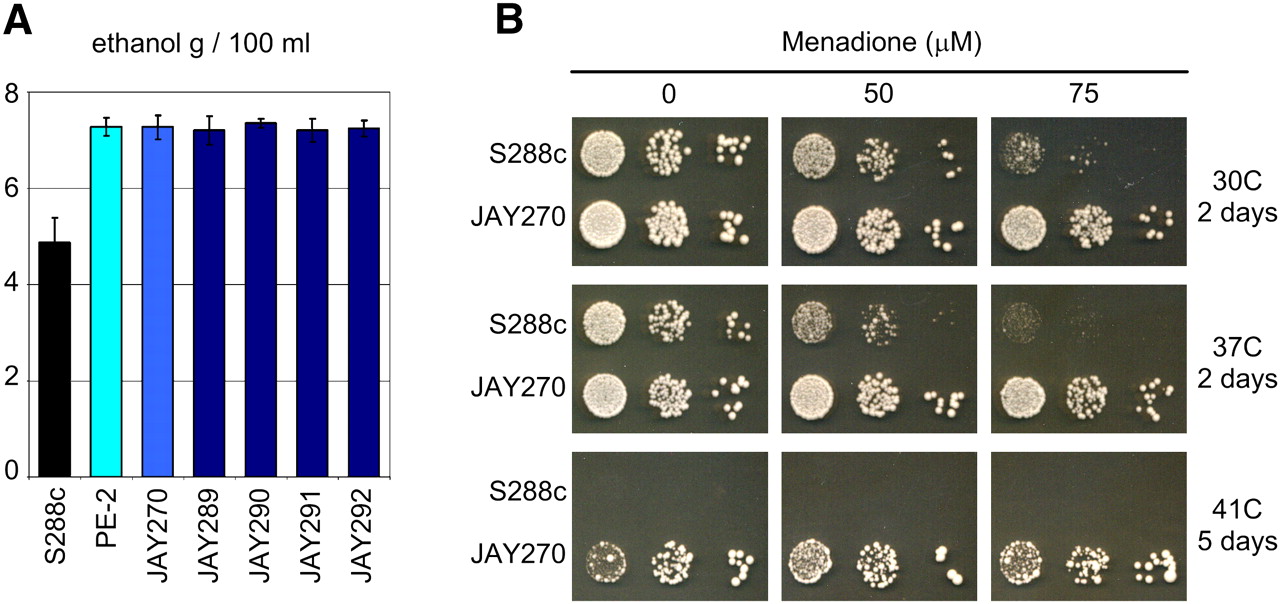 Comparative phenotypic analysis of JAY270 and S288c. (A) Sugar cane extract fermentation assays (∼18% sucrose). The ethanol concentration shown is the average reached in four fermentation assay repetitions, each comprised of four consecutive 15 h of fermentation at 30°C with cell recycling (see Methods for details). (B) Reactive oxygen (menadione) and temperature effects on colony growth. Tenfold serial dilutions of saturated cultures spotted (5 μL) in rich medium (YPD) containing various concentrations of menadione were incubated at the indicated temperatures and scanned after the indicated incubation period. The S288c-isogenic control strain used in A was the BY4741 haploid and in B was the JAY309 diploid.