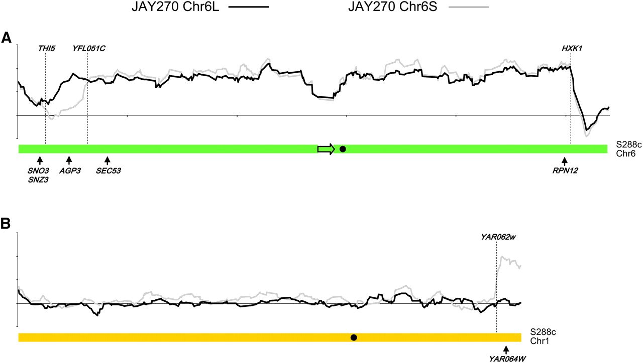 Band-array analysis of Chr6L and Chr6S homologs in JAY270. The curves indicate the normalized hybridization signal of specific chromosomal DNA samples (y-axis) to probes arranged according to their chromosomal coordinates (x-axis) in S288c (A) Chr6 and (B) Chr1. The dashed vertical lines indicate the breakpoints where JAY270 Chr6S and Chr6L differ from each other and from the S288c chromosomes. Only the data for Chr6 and Chr1 probes are shown. No hybridization signal was detected for other S288c chromosomes, with the exception of the right end of Chr8, which is essentially identical to Chr1. SEC53 and RPN12 indicate the most distal essential genes in S288c Chr6, and SNO3, SNZ3, AGP3, and YAR064W indicate the position of Southern blot probes used in Figure 4. The signal valley in the central position of Chr6 corresponds to the position of the YFLWTy2-1 retrotransposable element (arrow) that is not present in the JAY270 Chr6 homologs. (Black circles) Centromere positions.