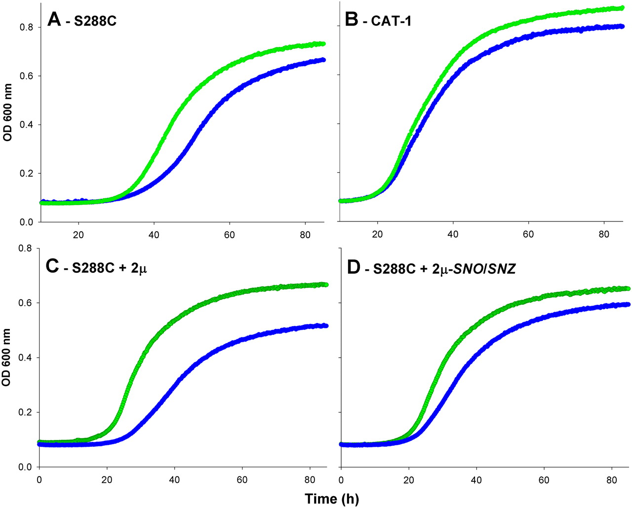 Typical growth curves of the diploid S288C-derived laboratory yeast strain GSY157 (A), the industrial fuel ethanol CAT-1 strain (B), as well as the diploid laboratory ura3/ura3 yeast strain FY1679 transformed with a multi-copy 2μ URA3+ control (no-insert) plasmid (C), or with the same plasmid containing a cloned SNO/SNZ gene pair from strain S288C (pBD1001) (D), in synthetic defined media (see Methods) containing 200 g/L glucose and lacking both pyridoxine and thiamin (green), or the same media supplemented with 1 mg/L of thiamin (blue).