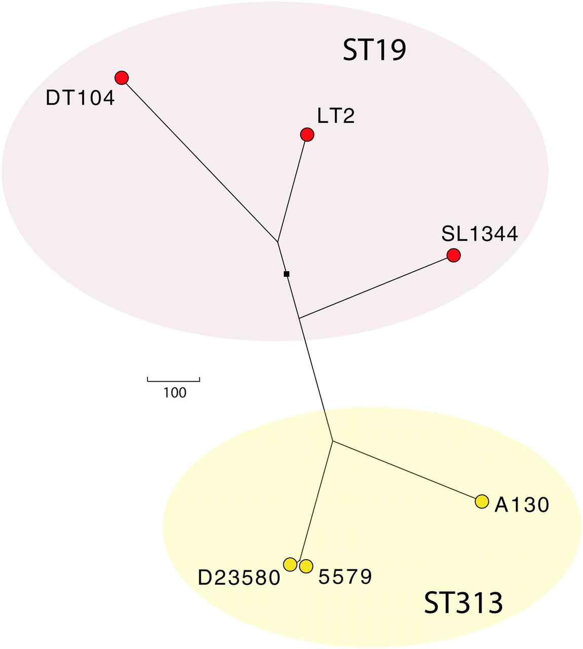 Radial phylogram based on chromosomal SNPs showing the phylogenetic relationship of sequenced S. Typhimurium isolates. Branch lengths indicate the number of SNPs, scale as indicated, separating the sequenced isolates indicated by circles. ST19 isolates (red circles) and ST313 isolates (yellow circles) are shown. The black square indicates the ancestral root.