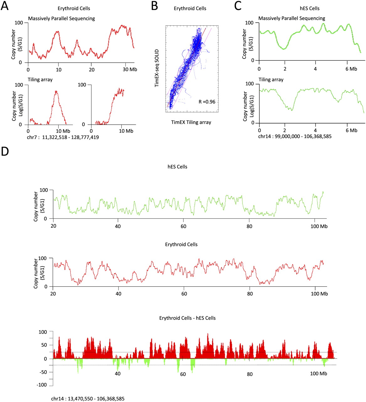 TimEX-seq. (A) Comparison of TimEX results obtained using tiling arrays or massively parallel sequencing (basophilic erythroblasts). The S/G1 ratio of the frequency of uniquely matched reads in 5-kb windows was calculated and smoothed as in Figure 1. (X-axis) Genomic distances; (y-axis) S/G1 ratio for sequencing, and log2 (S/G1) for tiling arrays. Sequencing and tiling arrays produce very similar profiles. (B) Coefficient of correlation between tiling array and sequencing results. (C) Comparison of TimEX results obtained using tiling arrays or massively parallel sequencing (hESC). (D, top) Examples of chromosome-wide TimEX-seq profiles obtained based on 10.5 million (basophilic erythroblasts) and 13 million reads (hESC). A sigma of 100 kb was used for the Gaussian convolution. (Bottom) Differential timing curve for hESC and erythroid cells obtained by subtracting the hESC profile from the erythroid profile.