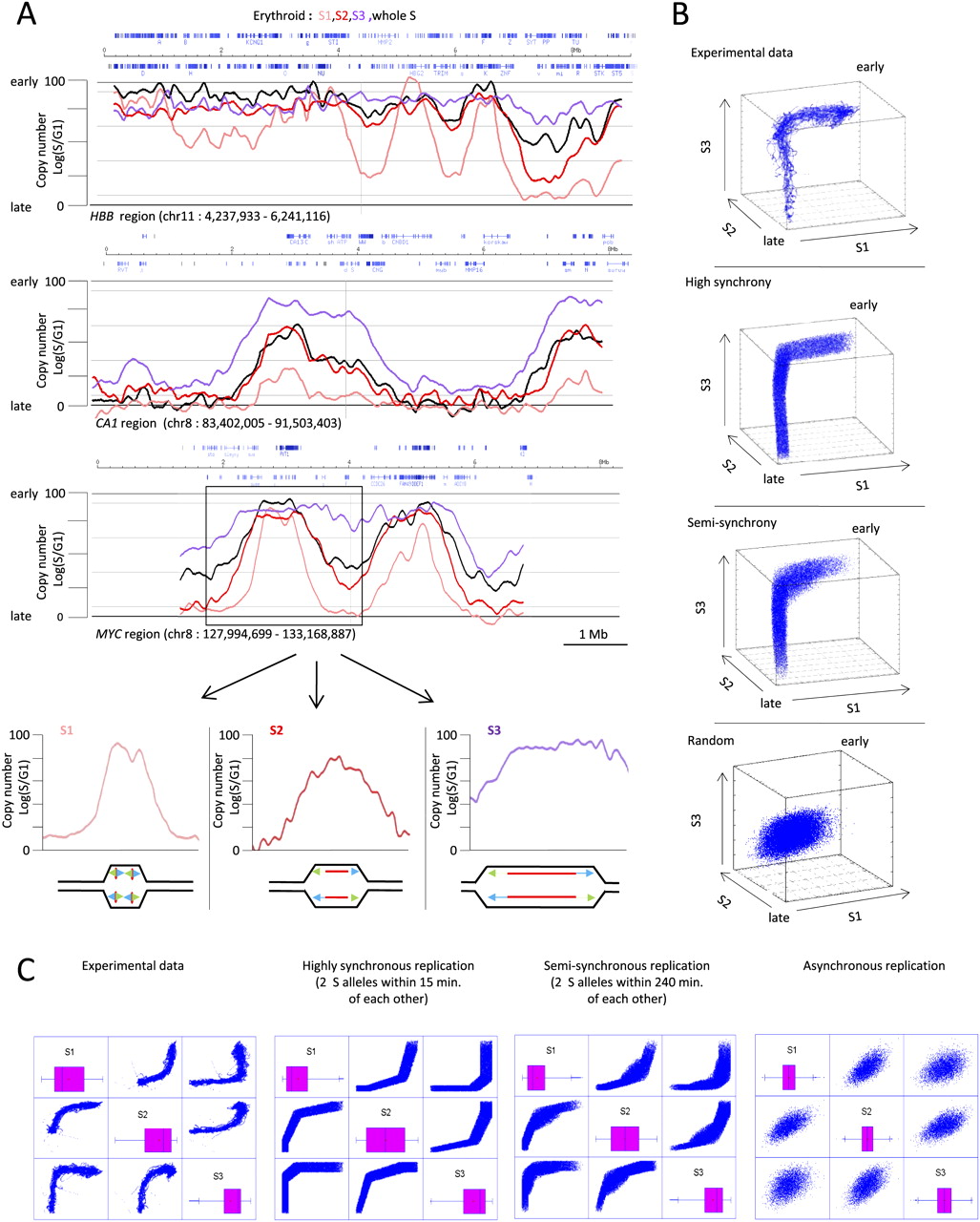 S-phase subfractionation experiments. (A) Scatterplots illustrating TimEX profiles for three genomic regions 5–8 Mb in size. The black curve represents the results for the entire sorted S phase; the pink, red, and purple curves the profiles for the early, middle, and late fractions, respectively. As expected, the profile of the whole S fraction resembles the average of the three fractions. The timing of replication varies over large domains. Analysis of these curves suggests that replication is highly regulated. (Bottom) Our molecular interpretation of one of the two major peaks observed in the myc region. Blue and green arrows represent progressing forks of replication; (red lines) newly replicated DNA. (B, top) Three-dimensional scatterplots illustrating the experimental S/G1 ratio of the early, middle, and late (S1/S2/S3) fractions plotted for all 10-kb genomic windows represented in the array. The three panels below illustrate the S1/S2/S3 scatterplots obtained from simulations in which the replication is assumed to be perfectly synchronous, semisynchronous, or asynchronous (see text, movies M1–M4, and Supplemental Fig. S9 for more plots and the algorithms used for the simulations). The experimental data are most similar to the synchronous replication model, suggesting that the order in which DNA is replicated during S phase is highly regulated. (C) Two-dimensional projections of the three-dimensional plots of B.