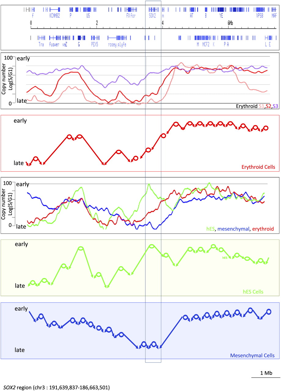 Model of DNA replication in mammalian cells. (Top panel) An 8-Mb region centered on the SOX2 gene region; the second panel is the result of a TimEX analysis of sorted early, middle, and late S fractions from basophilic erythroblasts. The red circles in the third panel represent the major zones containing origins of replication that can be deduced from an analysis of the second panel; the arrows show the predicted fork direction in erythroid cells starting from these origins. The main features of the model are that (1) active origins of replication are unevenly distributed in the genome and relatively rare in parts of the genome, creating large initiation free regions, (2) origins are programmed to fire within narrow time windows during S phase, (3) lack of pause sites creates long transition regions in which the forks progress unidirectionally. The fourth panel represents the TimEX profiles of whole S fractions from basophilic erythroblasts (red), mesenchymal cells (blue), and hESC (green) in the same region. The two bottom panels illustrate the predicted organization of the replication of this genomic segment in hESC and mesenchymal cells. One segment with major differences in timing between the three cell lines is boxed in the immediate neighborhood of the SOX2 gene, which is expressed at a high level in hESC and silent in erythroid and mesenchymal cells (data not shown). Because of the paucity of active origins in the region, the tissue-specific activation in hESC of an early origin or zone of initiation, which appears to coincide with the SOX2 gene, has dramatic repercussions in both the timing of replication and the fork directions in a megabase-wide region.