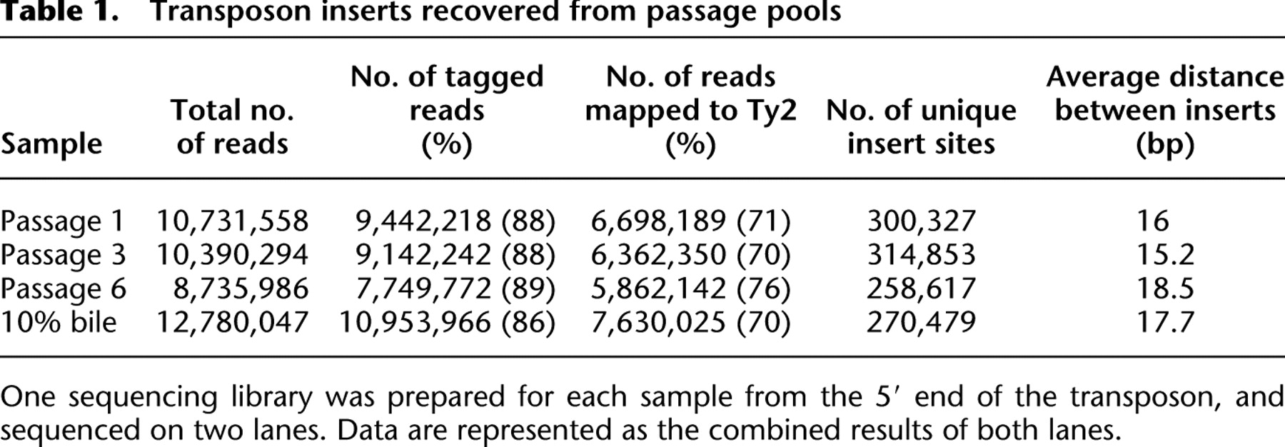 One sequencing library was prepared for each sample from the 5′ end of the transposon, and sequenced on two lanes. Data are represented as the combined results of both lanes.