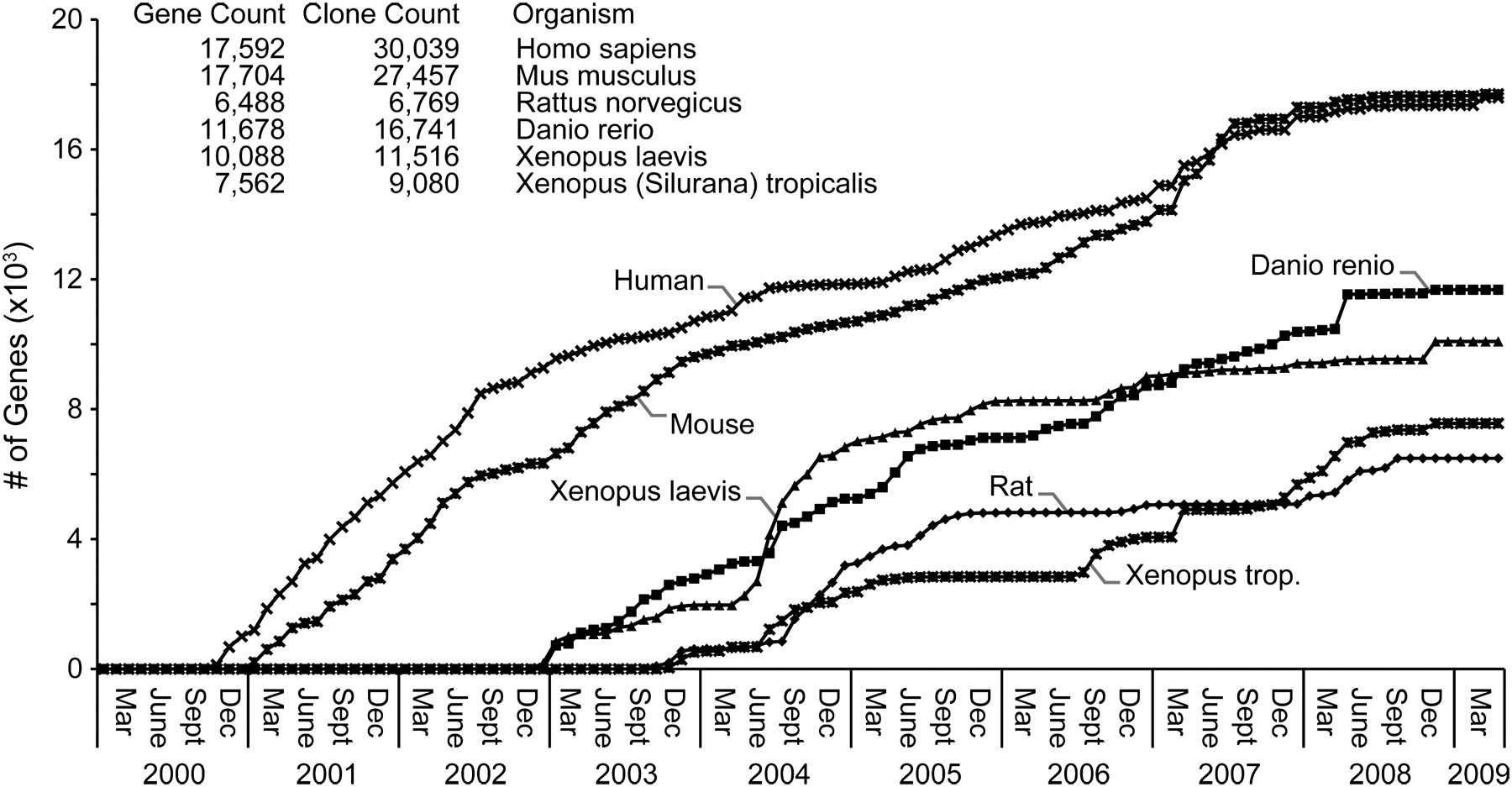 Cumulated gene counts for MGC, XGC, and ZGC. The progressive addition of clones, measured by genes represented in each collection, is shown for MGC, XGC, and ZGC from the beginning to conclusion of these programs. “Gene Count” is the total final number of RefSeq genes represented by each set of clones. This number includes some noncurated genes (XM accessions) that are not counted in Table 1. “Clone Count” includes all clones, including duplicate transcripts and isoforms. Isoforms constitute 2%–3% of the human, mouse, and rat collections.
