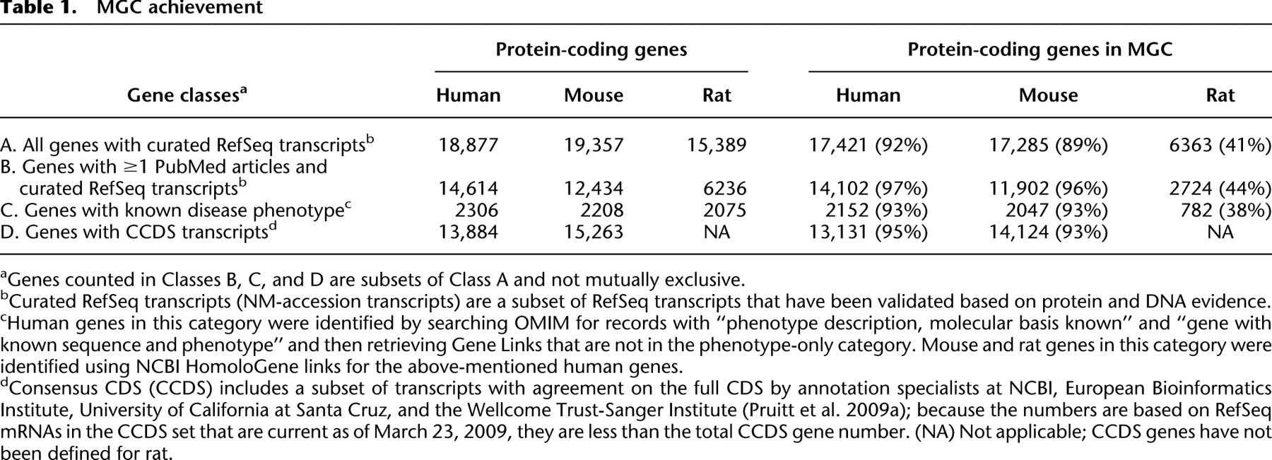 dConsensus CDS (CCDS) includes a subset of transcripts with agreement on the full CDS by annotation specialists at NCBI, European Bioinformatics Institute, University of California at Santa Cruz, and the Wellcome Trust-Sanger Institute (Pruitt et al. 2009a); because the numbers are based on RefSeq mRNAs in the CCDS set that are current as of March 23, 2009, they are less than the total CCDS gene number. (NA) Not applicable; CCDS genes have not been defined for rat.