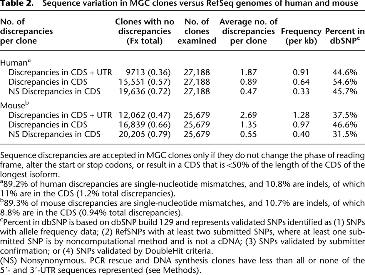 Sequence discrepancies are accepted in MGC clones only if they do not change the phase of reading frame, alter the start or stop codons, or result in a CDS that is <50% of the length of the CDS of the longest isoform.