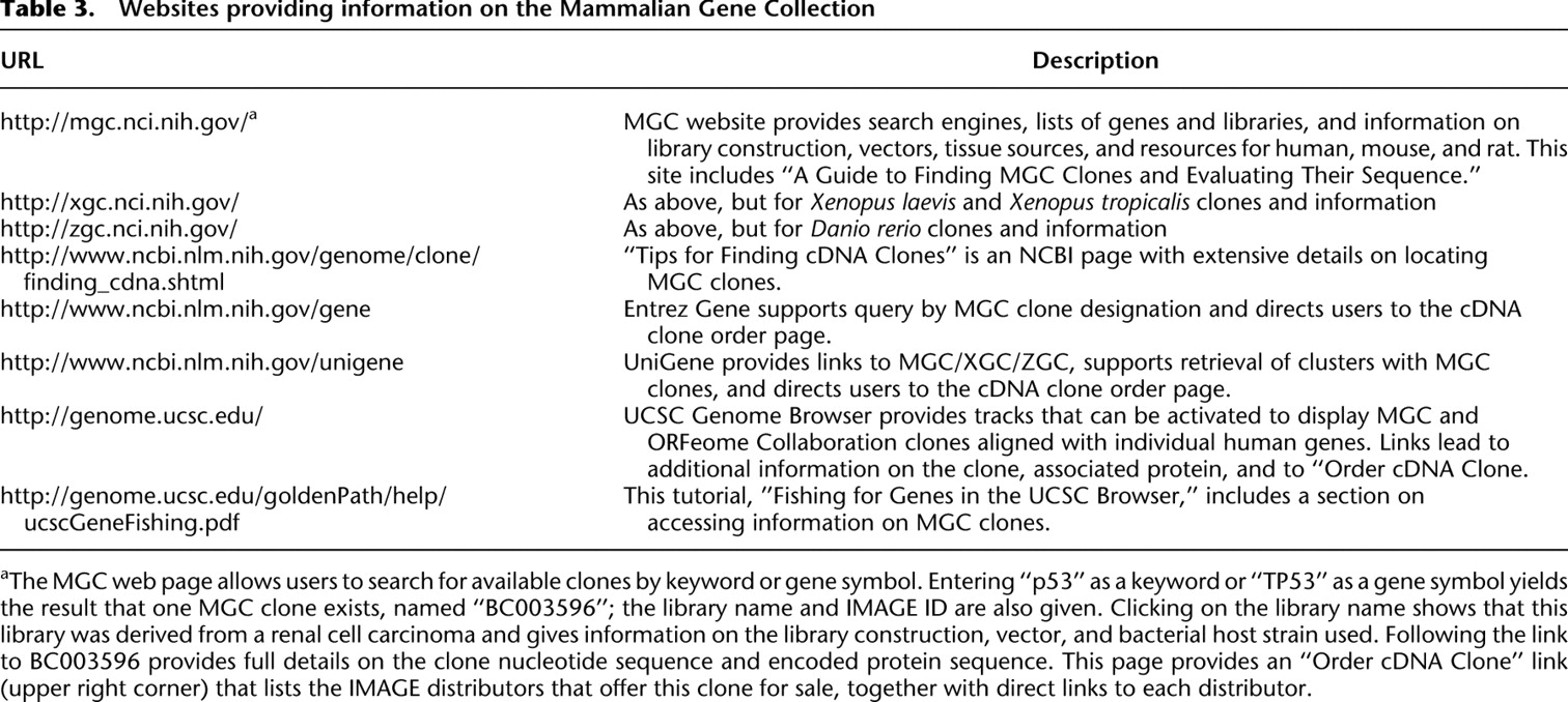 aThe MGC web page allows users to search for available clones by keyword or gene symbol. Entering “p53” as a keyword or “TP53” as a gene symbol yields the result that one MGC clone exists, named “BC003596”; the library name and IMAGE ID are also given. Clicking on the library name shows that this library was derived from a renal cell carcinoma and gives information on the library construction, vector, and bacterial host strain used. Following the link to BC003596 provides full details on the clone nucleotide sequence and encoded protein sequence. This page provides an “Order cDNA Clone” link (upper right corner) that lists the IMAGE distributors that offer this clone for sale, together with direct links to each distributor.
