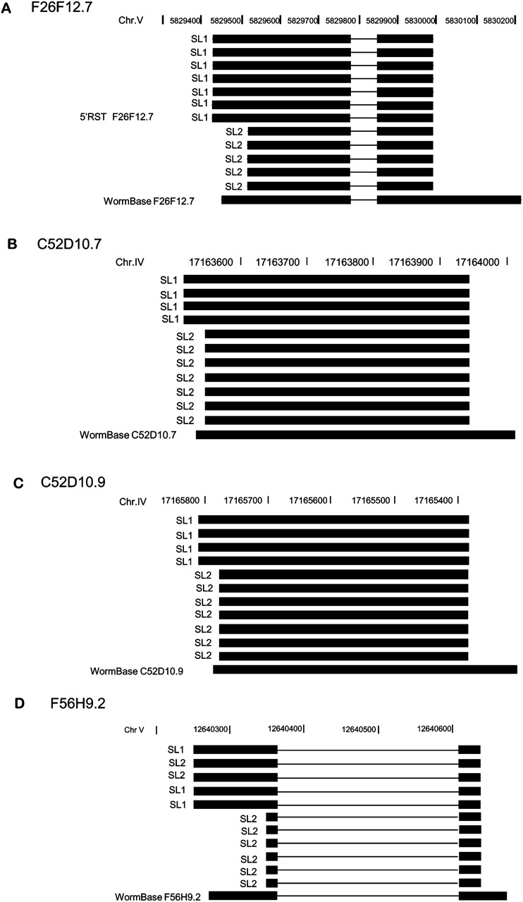 Examples of alternative trans-spliced leader usage. Single colony sequencing was done on RSTs that showed evidence of mixed trans-splicing. (A–C) Alignment of reads obtained from individual 5′-RACE clones shows association of SL1 and SL2 to different transcript variants. (D) Alternative usages of SL1 and SL2 were observed for the longer transcript variant, while SL2 trans-splicing is observed for the shorter variant.