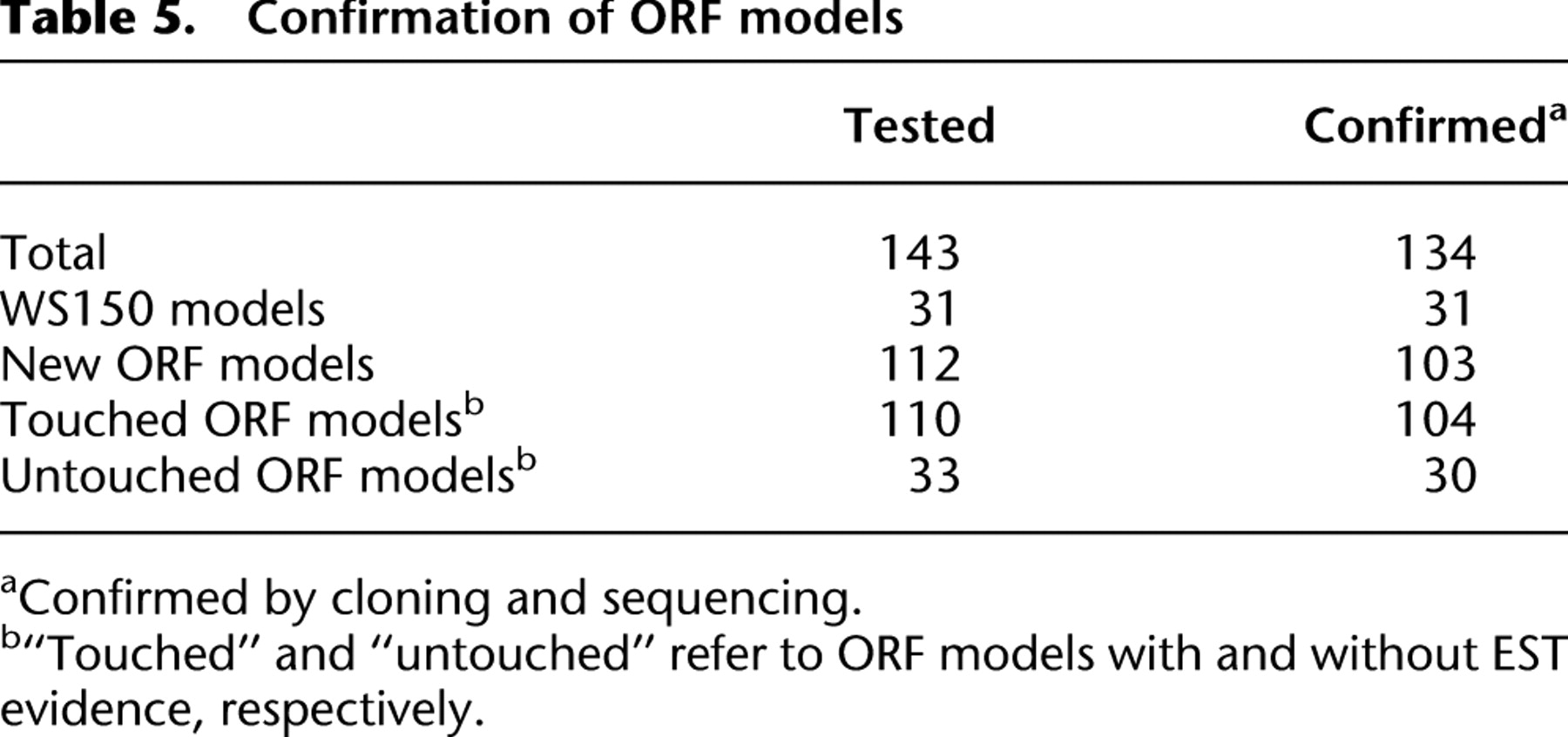 b“Touched” and “untouched” refer to ORF models with and without EST evidence, respectively.