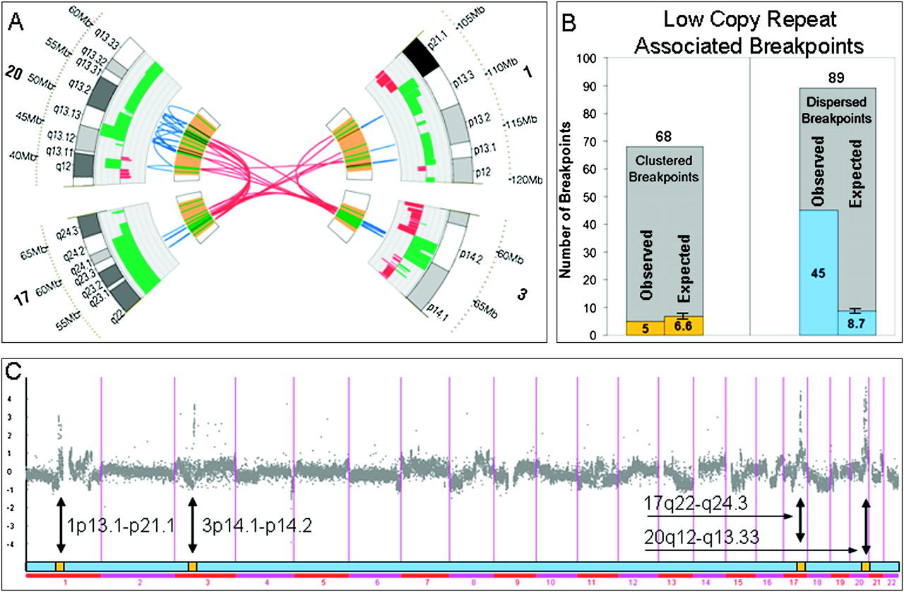 (A) Four clusters of breakpoints at 1p13.1-21.1, 3p14.1-p14.2, 17q22-q24.3, and 20q12-q13.33. (B) Low copy repeat (LCR) association with clustered and dispersed breakpoints. (C) The four clusters of breakpoints correspond exactly to the four highly amplified regions in MCF-7, as determined by array CGH.