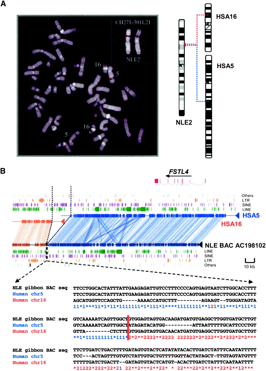 (A) Identification of gibbon BAC clones at the breakpoint of synteny. All BAC clones were experimentally validated by FISH as described previously (Roberto et al. 2007). In this example, a gibbon BAC clone spanning the breakpoint shows a single signal on gibbon chromosome 2 (NLE 2), but FISH mapped to human shows two signals on chromosomes 5 and 16, identifying an interchromosomal rearrangement (as represented by the chromosomal ideogram). (B) Sequence architecture at human–NLE gibbon synteny breaks. (Top panel) Miropeats analysis of the gibbon BAC, CH271-301L21 (AC198102), when compared with segments of human chromosome 5 (132461336–132644892, blue) and chromosome 16 (73369800–73421145, orange). Representative repeat elements, LINE, SINEs, LTRs, segmental duplications, and genes mapping to the synteny blocks with arrows denoting transcriptional orientation are also shown based on human genome annotation. (Bottom panel) Three-way ClustalW alignment between human and NLE gibbon sequences at the breakpoint with 1 (blue) denoting a sequence identity with the human chromosome 5 segment and 2 (orange) indicating sequence identity with the human chromosome 16 segment. The figure shows a class I breakpoint where the human breakpoints abut precisely at the point of fusion on the gibbon chromosome.