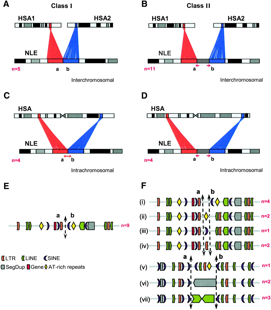 Class I and class II breakpoints. The schematic shows the types of rearrangements identified by high-resolution sequence analysis: Class I and class II breakpoints causing inter- (A,B) or intrachromosomal (C,D) rearrangements are shown. Based on the sequence context, the number (n) of different human–gibbon breakpoints identified from both categories (E,F) are also shown. Note that the class II breakpoints contain: (i) nonrepeat sequences, (ii) AT-rich repeats, (iii) SINEs (AluY element), (iv) LTR insertions, (v) a “hodgepodge” of repeats, (vi) segmental duplications, and (vii) LINE-1 elements. The diagram is not to scale.