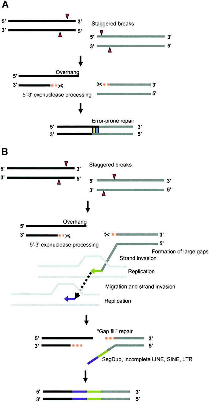 Models for human–NLE gibbon rearrangements. (A) An error-prone repair mechanism for smaller breakpoint intervals (<20 bp). DNA strands from two chromosomes (black and gray bars) are shown. Staggered double-strand breaks are processed by 5′–3′ exonuclease, creating overhangs. These overhangs are filled by an error-prone repair mechanism, creating shorter insertions. (B) “Gap-fill” model for larger breakpoint intervals. Large gaps are generated by double-strand breaks (due to possible collapsed or stalled replication forks) at rearrangement sites. These staggered breaks are processed by exonucleases to generate long 3′ overhangs. Replication is initiated by strand invasion to repair the gap. However, likely due to low processivity of the replication-dependent repair process (McVey et al. 2004), only smaller-length sequence stretches are synthesized. Consequently, a series of strand invasion, replication, and uncoupling of the replication machinery is necessary to fill the large gap. Thus, a less-efficient replication-based repair process generates a mosaic of incomplete repetitive elements at the larger breakpoint intervals.