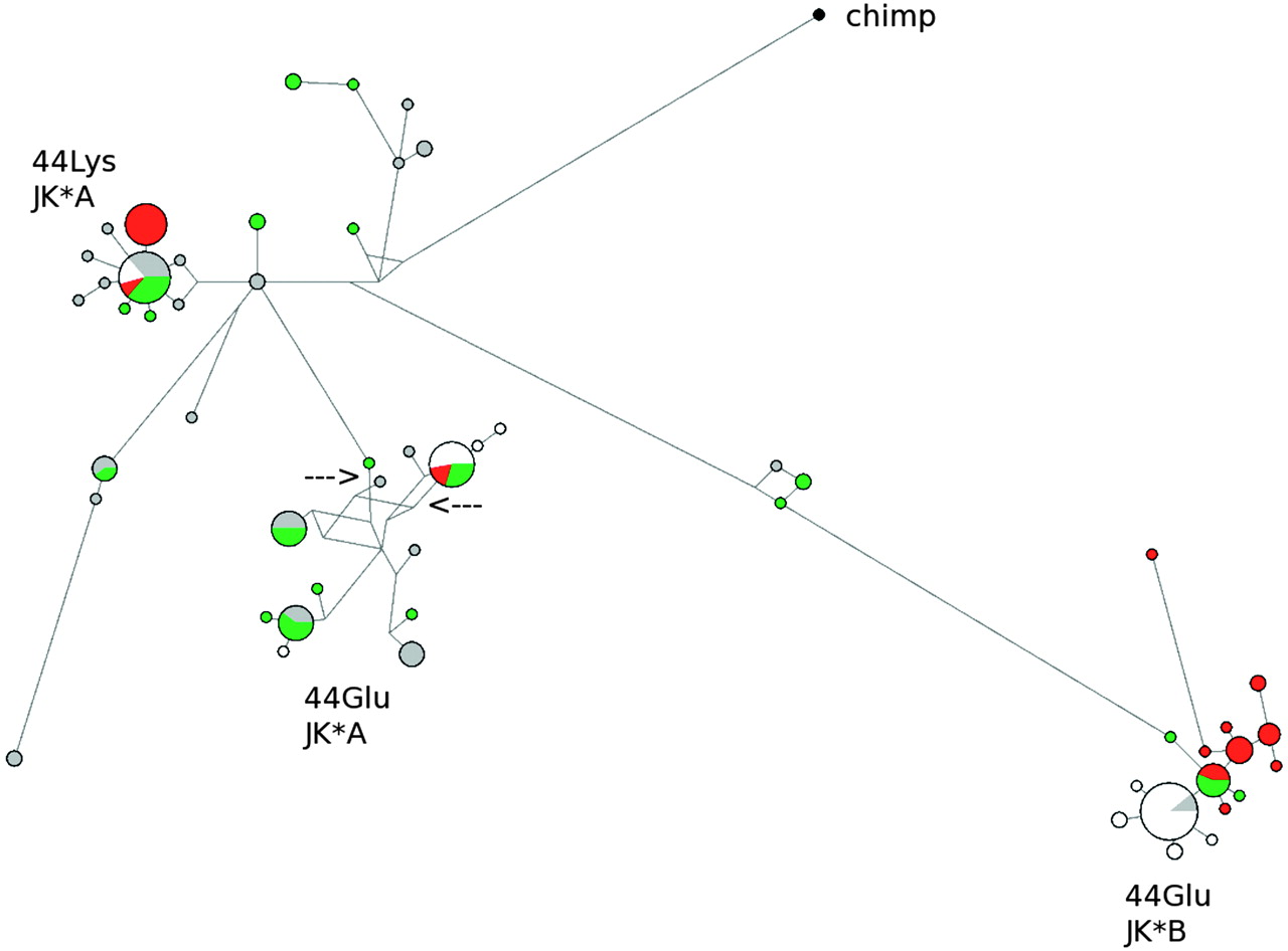 Genealogy of SLC14A1 haplotypes reconstructed through a median-joining network. The analysis corresponds to the gene region spanning nucleotides 4887–17,350. Population color codes are as follows: (green) AA; (white) EA; (red) AS; (gray) YRI. The allelic status at amino acid position 44 and 280 (JK*A/JK*B) is reported for the three major clusters. The two arrows denote the position of rs10853535 and rs692899, which correlate with pathogen richness (Table 1).