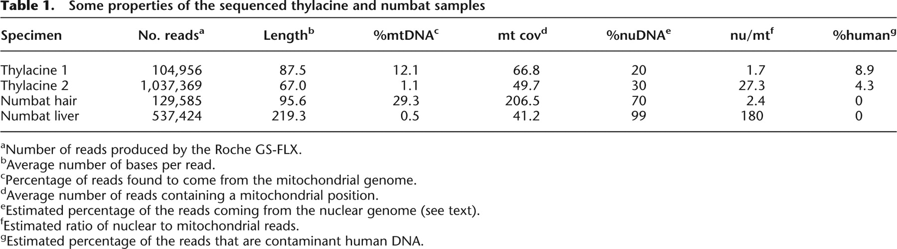 Some properties of the sequenced thylacine and numbat samples