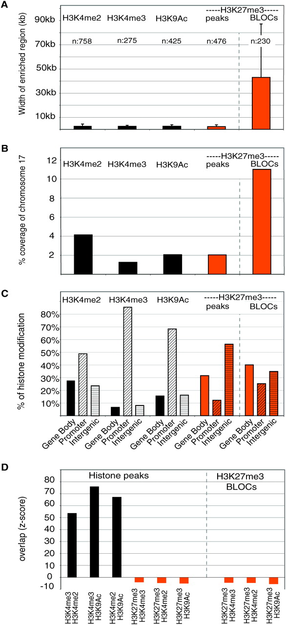 Overview of active and repressive marks on mouse chr 17 in MEFs. The analysis of modifications forming peaks (H3K4me2, H3K4me3, and H3K9Ac) was based on the sum of all chr 17 regions with a probe density of at least eight oligonucleotides per 1500 bp. The analysis of modifications forming BLOCs (H3K27me3) was based on the whole mouse chr 17 tiling array. Data from two independent MEF cell lines (MEFB1 and MEFF) were merged for all analyses (Supplemental Table 1). (A) Chromosome-wide analysis showing the average width of genomic regions enriched by four histone modifications on chr 17, as analyzed by ChIPOTle (all modifications) or the BLOCs algorithm (H3K27me3). Only regions found to be enriched in all technical and biological replicates (Supplemental Table 1) were used in this analysis. (B) The percentage of chr 17 covered by four histone modifications analyzed by ChIPOTle peaks (all modifications) or the BLOCs algorithm (H3K27me3). (C) The percentage of ChIPOTle peaks (all modifications) or BLOCs (H3K27me3) located at the gene body excluding the promoter (solid bar), promoters (diagonally striped bar), and intergenic regions (horizontally striped bar). (D) The significance of overlap between genomic regions enriched for different histone modifications was calculated by identifying Z-scores for all possible pairs of ChIPOTle peaks (all modifications) and BLOCs (H3K27me3) (details in Methods). A high Z-score identifies an overlap that occurs more often than expected compared to a randomized data set.