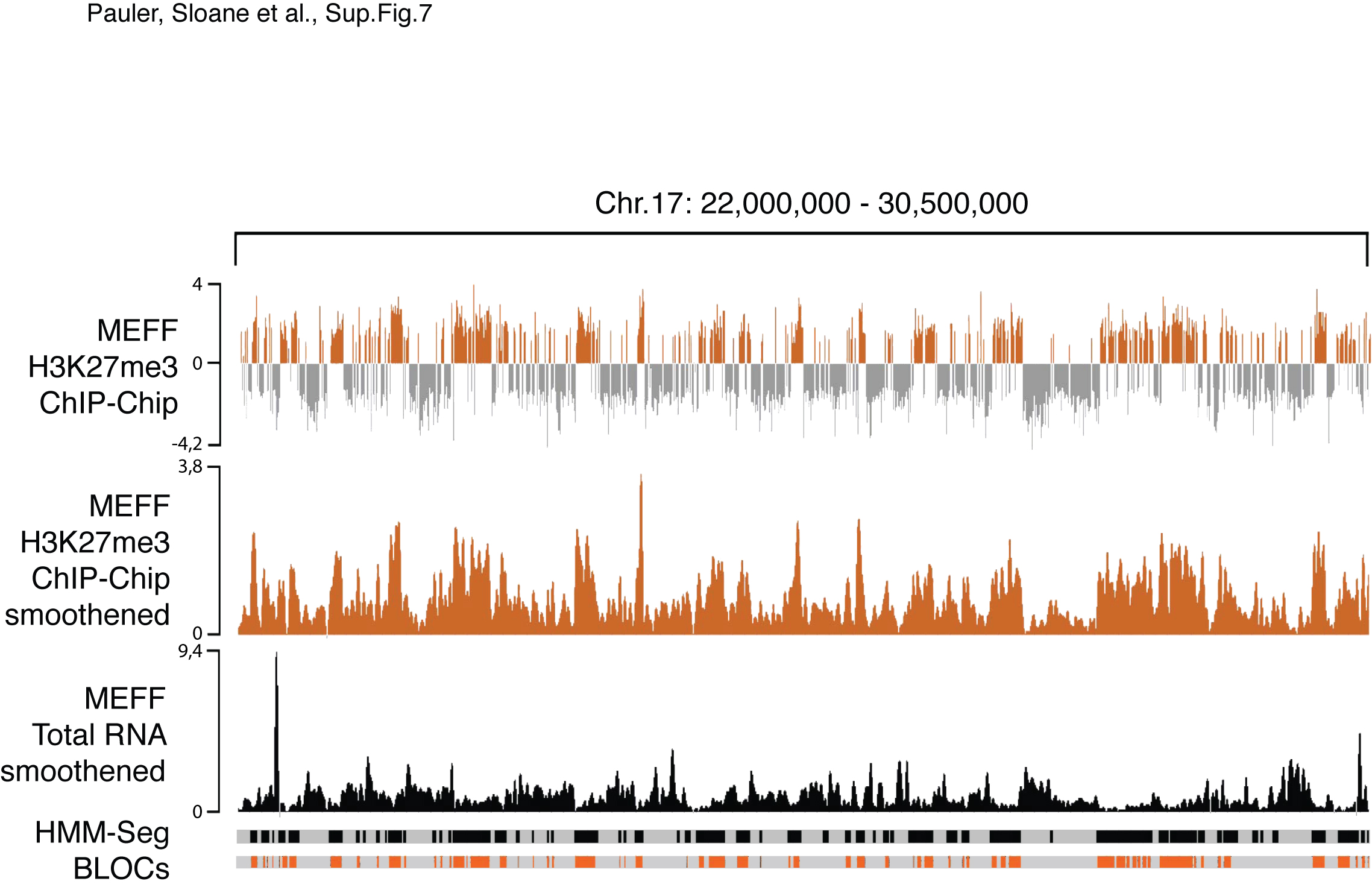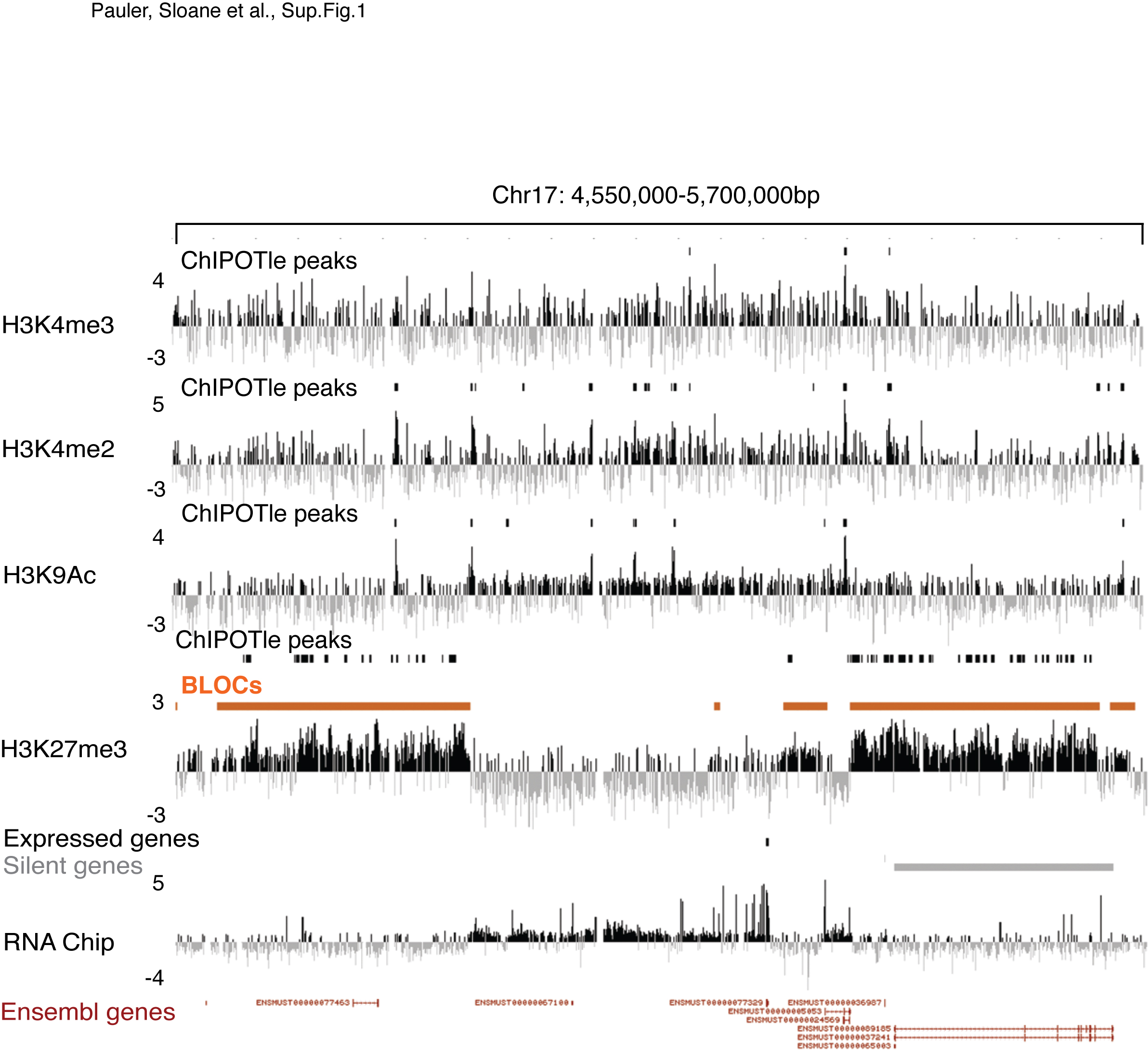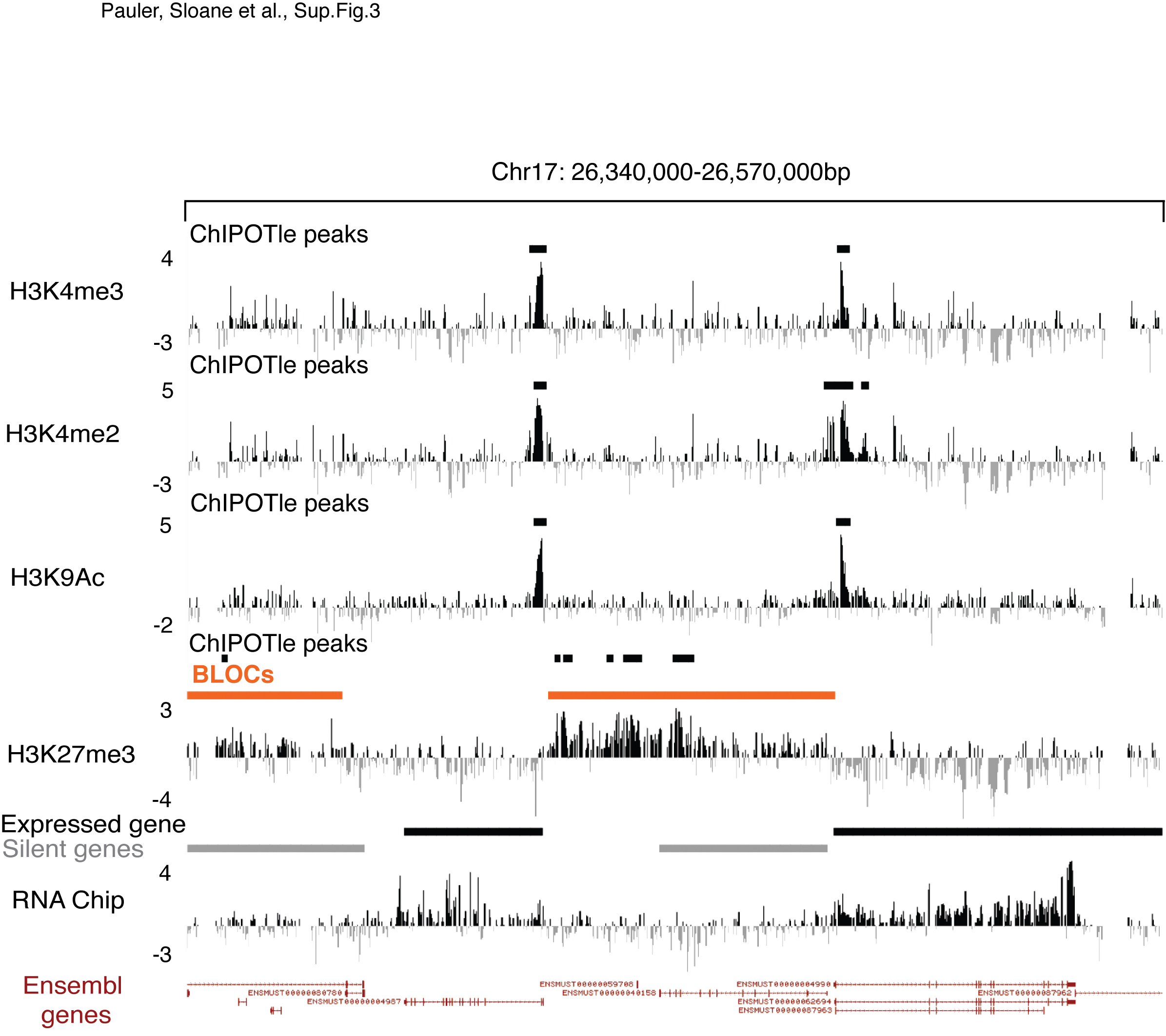H3K27me3 forms BLOCs over silent genes and intergenic regions and specifies a histone banding pattern on a mouse autosomal chromosome
