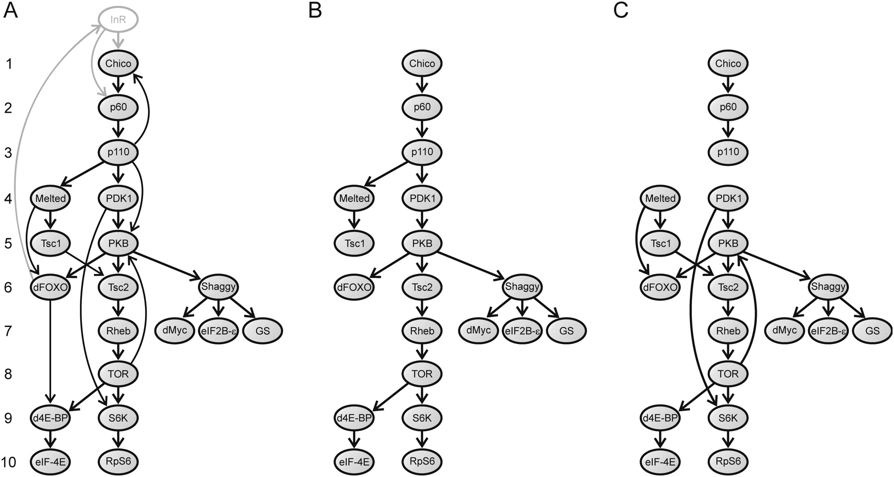 Graphs used in the network-level analysis. (A) Directed graph (G graph) representing the interactions across the D. melanogaster IT pathway elements. Arrows (arcs) indicate the direction of signal transduction. Numbers on the left represent the position of the elements in the pathway. (B) Graph T is a directed spanning tree of G used to compute the position of each element in the IT pathway (i.e., the number of signal transduction steps required to transduce the signal from InR to the downstream elements of the pathway). This graph was obtained by removing some arcs from G (according to specific biochemical criteria). We eliminated the three arcs involving feedback loops (activation of Chico by PIP3, which is synthesized by p110; activation of InR by the transcription factor dFOXO; phosphorylation of PKB by TOR). Furthermore, if a particular node is reached by different paths (d4E-BP, dFOXO, PKB, S6K, and Tsc2) we considered only one of them. For dFOXO, PKB, and S6K, we chose the longest path, since each of the paths allows the transduction of one necessary but not sufficient signal for the activation/inhibition of these proteins (i.e., the elements need to receive all the signals for activation/inhibition). Indeed, the recruitment of dFOXO to the cell membrane by Melt is a prior step to the phosphorylation (and consequent inhibition) of dFOXO by PKB (the Akt1 product). In the same way, the recruitment of PKB to the cell membrane through its interaction with PIP3 (synthesized by p110) is also a prior step to the phosphorylation of PKB by PDK1 (the Pk61C product). S6K needs to be phosphorylated by both PDK1 and TOR for full activation (Chou and Blenis 1995; Dufner and Thomas 1999; Avruch et al. 2001). d4E-BP (the Thor encoded protein) is an inhibitor of the pathway activated by its transcription factor dFOXO and inhibited by the TOR kinase. Given that only the second interaction activates the pathway, we eliminated the first from the analysis. (C) Graph S is a subgraph of G that includes only the direct physical PPIs between the elements of the IT pathway.