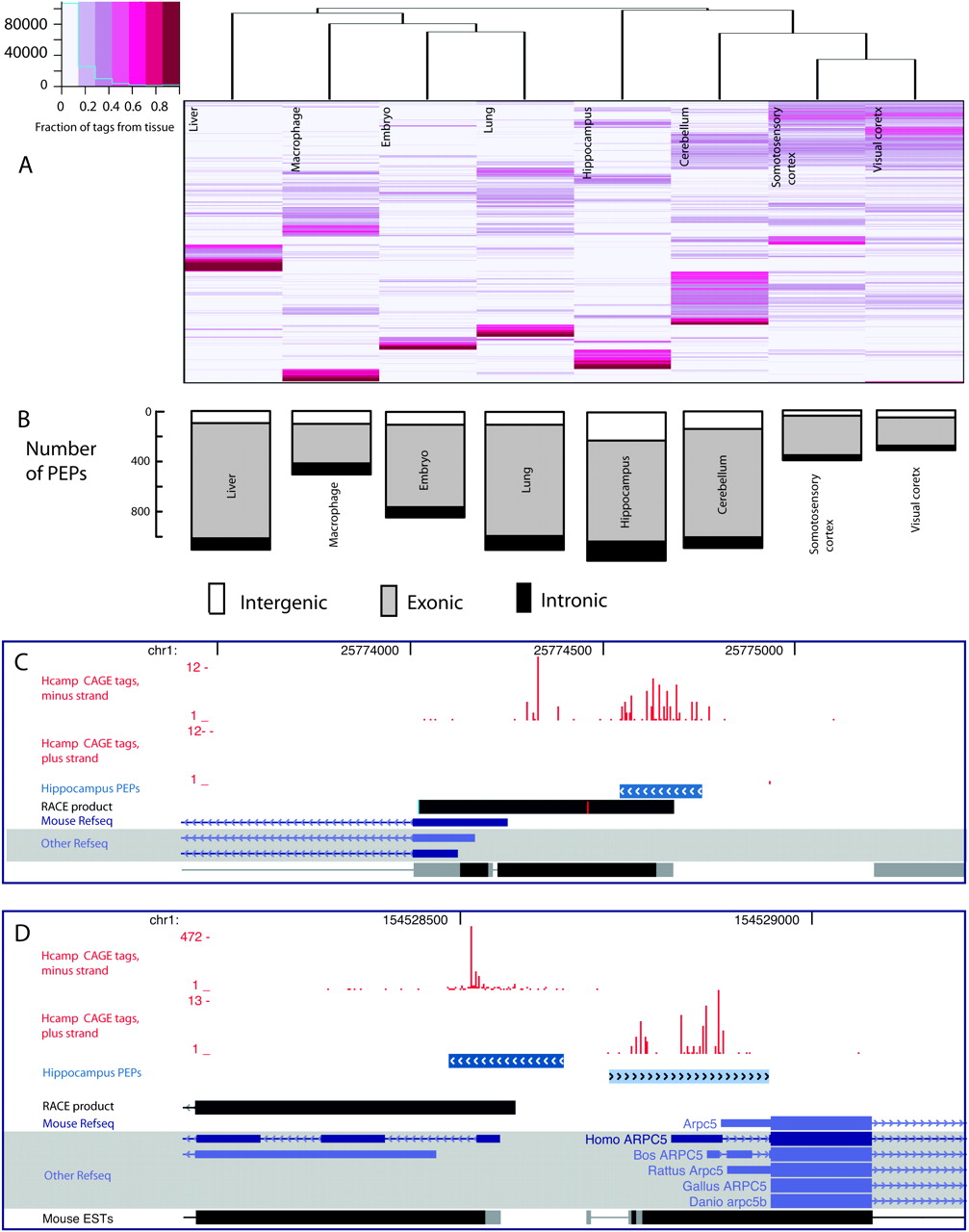 Exploration and validation of identified core promoters. (A) Exploration of tissue usage in all core promoters having more than 30 tags per million using hierarchical clustering, with CAGE tag expression data from the actual core promoters. Preferential usage for a certain tissue (fraction of tags belonging to the tissue in question) is color-coded as shown in the legend. Rows represent individual promoters (the row dendrogram is omitted because of the large number of rows), while columns are the different tissues. (B) Number of core promoters used preferentially in just one tissue (PEPs, as defined in Methods) and the locations of these core promoters relative to known genes. (C,D) Examples of discovery and validation of novel intergenic promoters expressed preferentially in hippocampus. All hippocampus tags are shown as red bar plots (one for each strand). Clusters of tags that are preferentially expressed in hippocampus (hippocampus PEPs) are shown as blue fragments where the color intensity is proportional to the fraction of tags in the cluster from hippocampus vs. other tissues. RACE products are in black. (C) The validation of a proximal alternative promoter to the Bai3 gene. (D) The validation of a promoter upstream of the Arpc5 gene but on the opposite strand; RACE as well as a human orthologous transcript show that this is a distal upstream promoter for the Rgl1 gene.